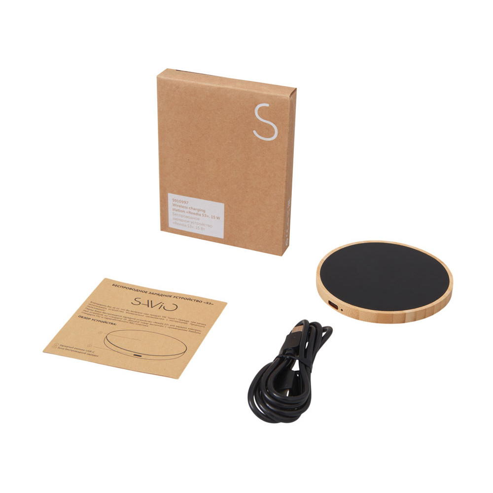 Беспроводное зарядное устройство с подсветкой лого Reedia S3, 15 Вт, бамбук, черный