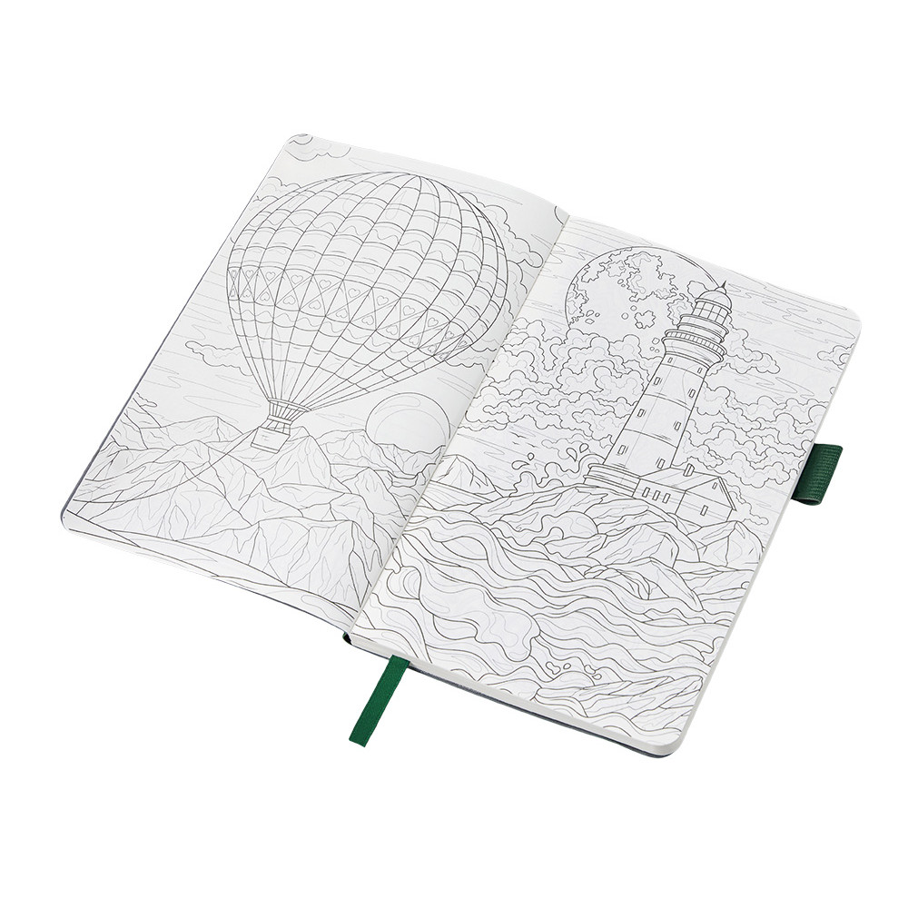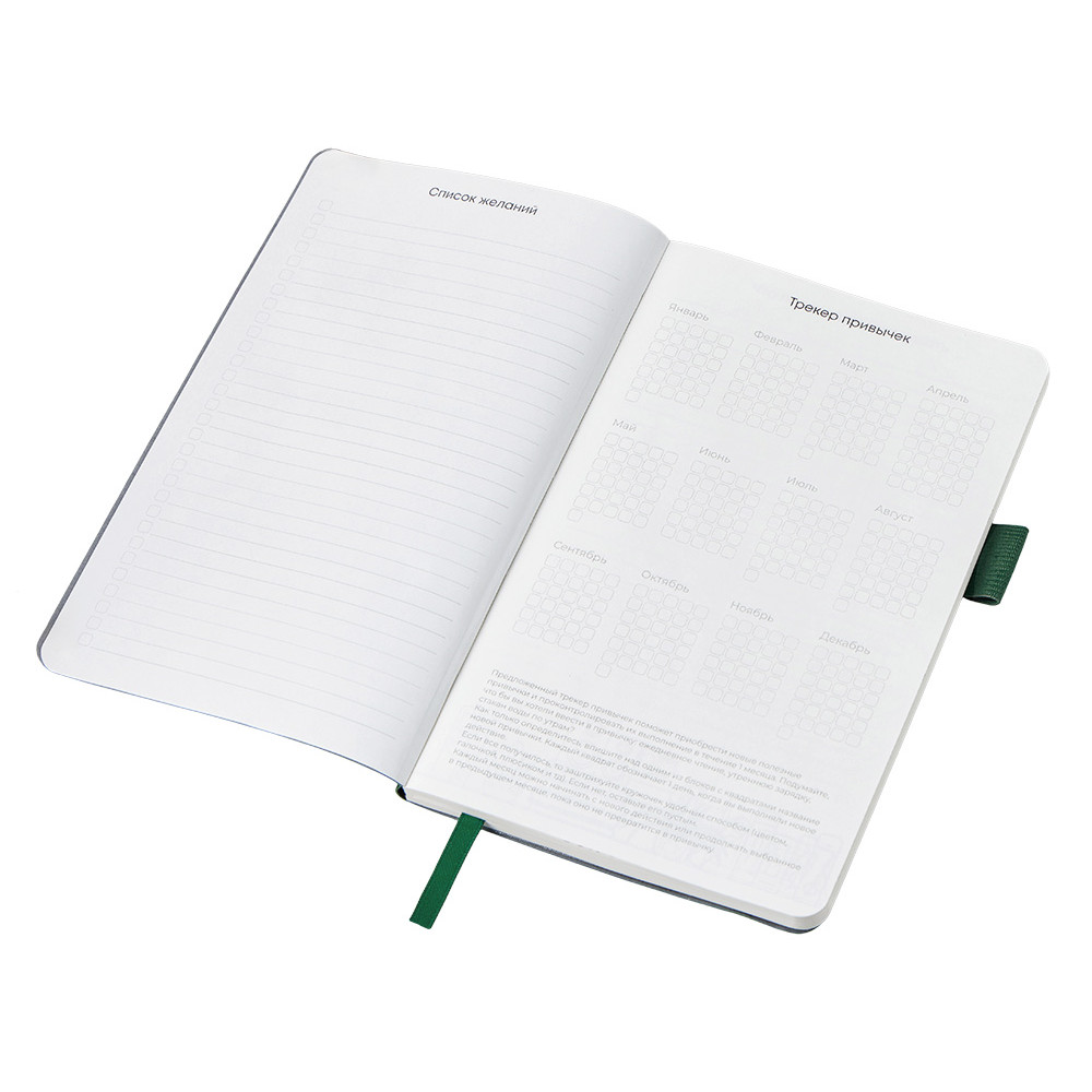 Необычный для блокнота вводный блок включает трекер привычек, списки книг и фильмов, а также 4 страницы для раскрашивания с картинками и мандалами.