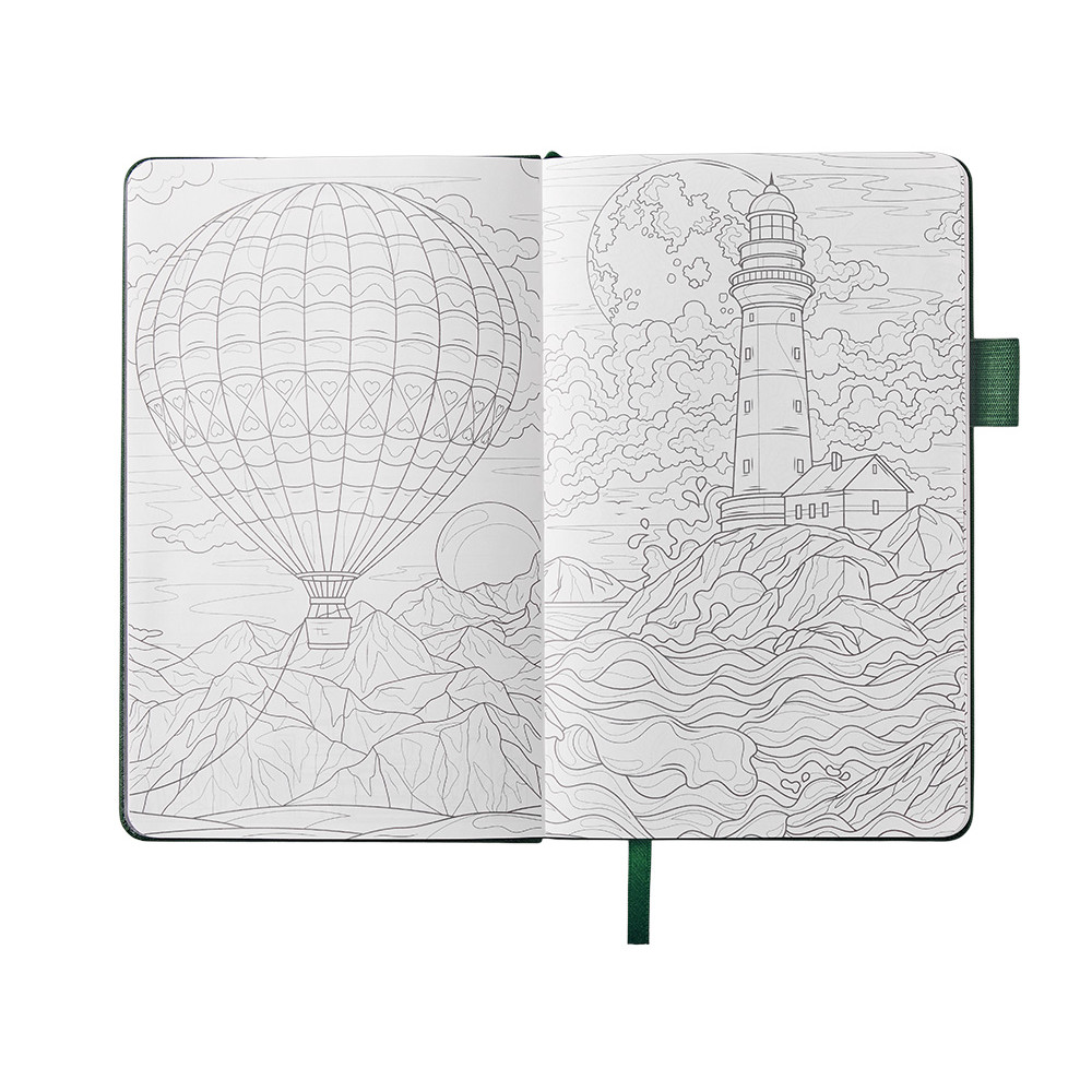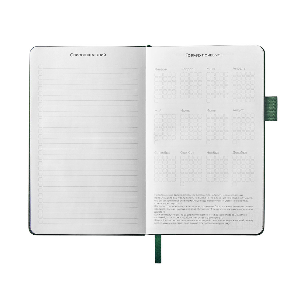 Необычный для блокнота вводный блок включает трекер привычек, списки книг и фильмов, а также 4 страницы для раскрашивания с картинками и мандалами.