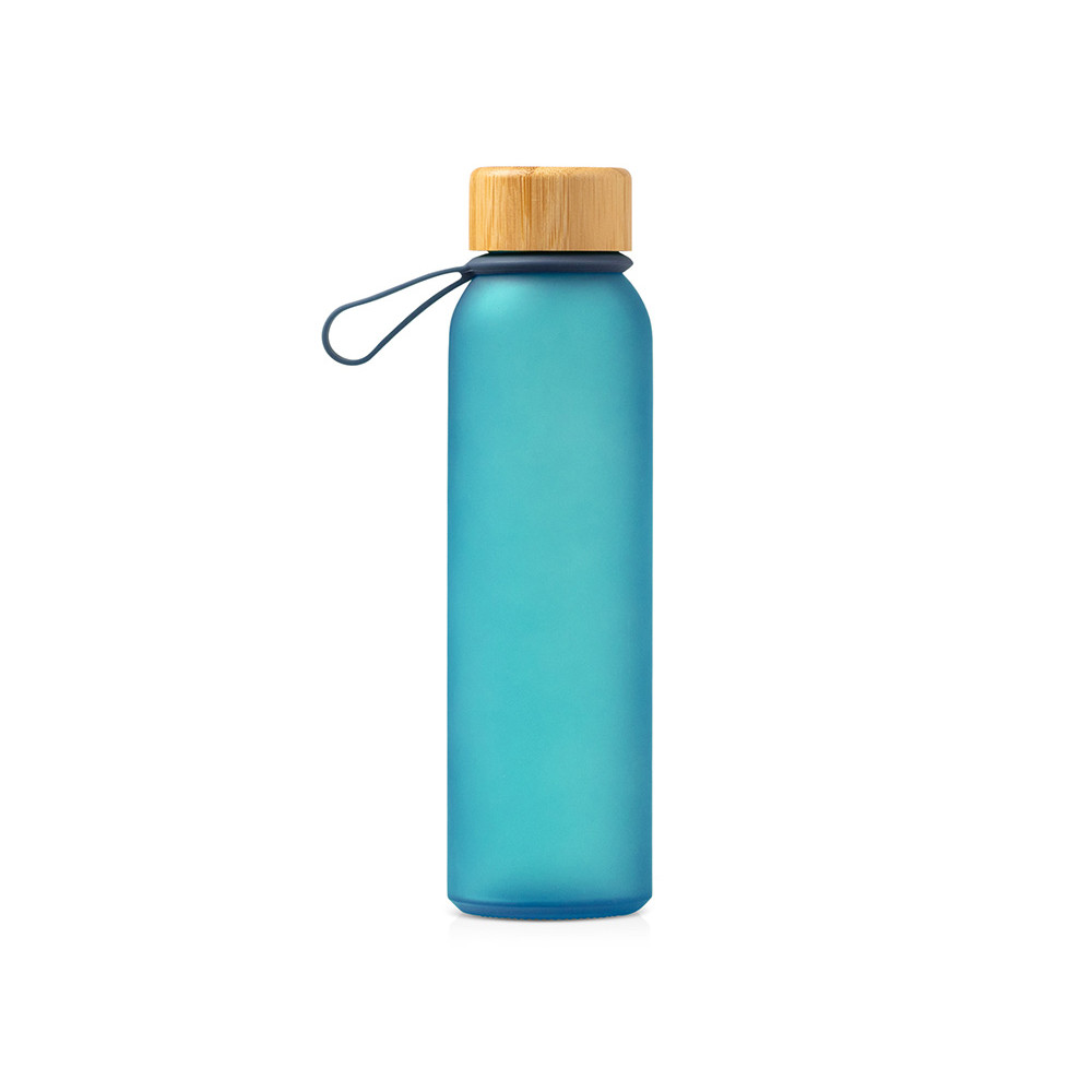 Полупрозрачная бутылка из переработанного стекла. Бамбуковая крышка с держателем. Объём: 500 мл. Поставляется в индивидуальной коробке.