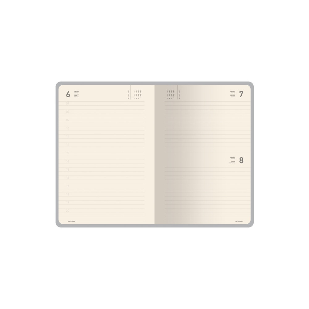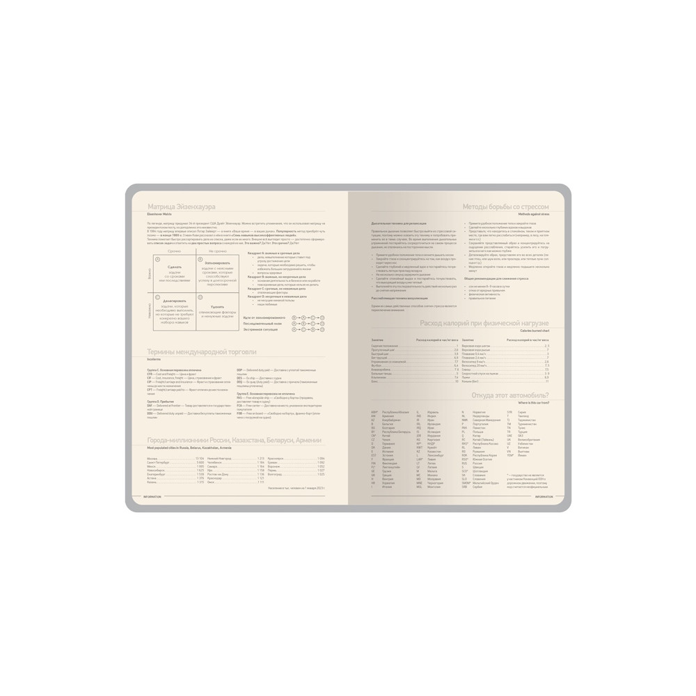 Внутренний блок выполнен из бежевой бумаги плотностью 70 г/кв.м и содержит 14 страниц справочной информации, а также датированные страницы с почасовой разметкой.