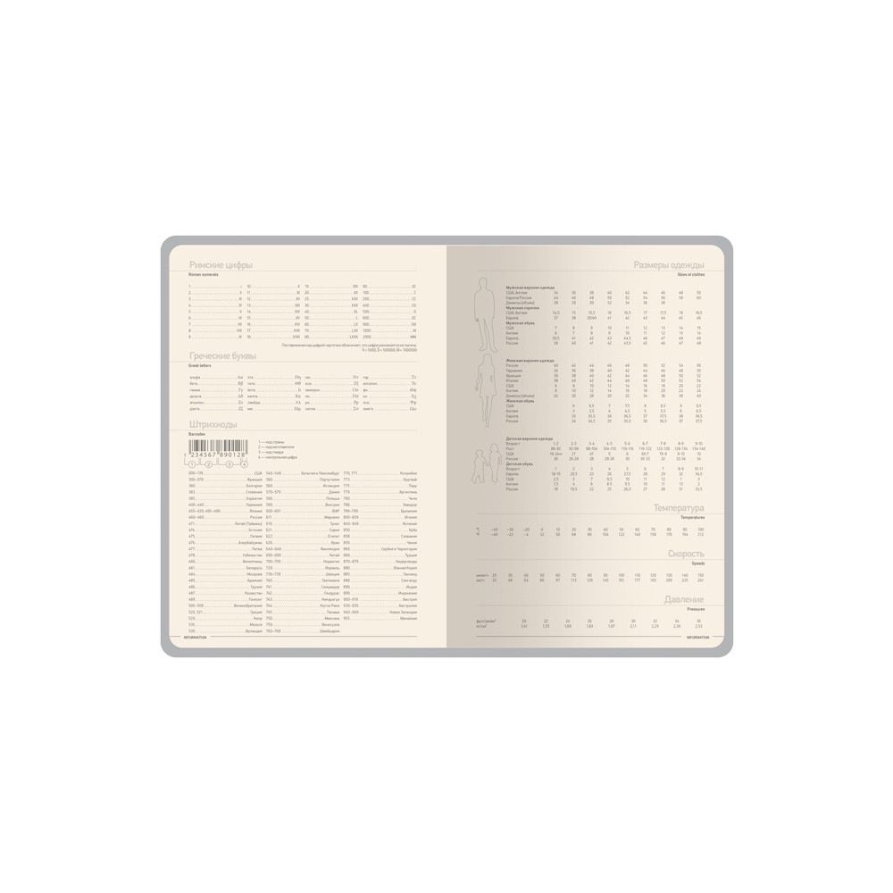 Внутренний блок выполнен из бежевой бумаги плотностью 70 г/кв.м и содержит 14 страниц справочной информации, а также датированные страницы с почасовой разметкой.