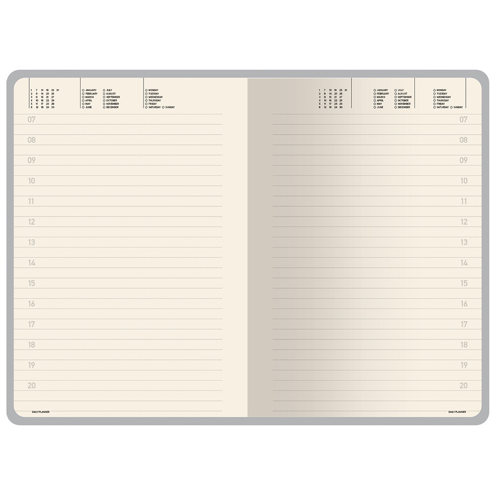 Недатированные страницы в серую линейку имеют отдельное место для проставления числа месяца и дня недели. Справочный блок на 17 страницах содержит полезную информацию из различных областей.