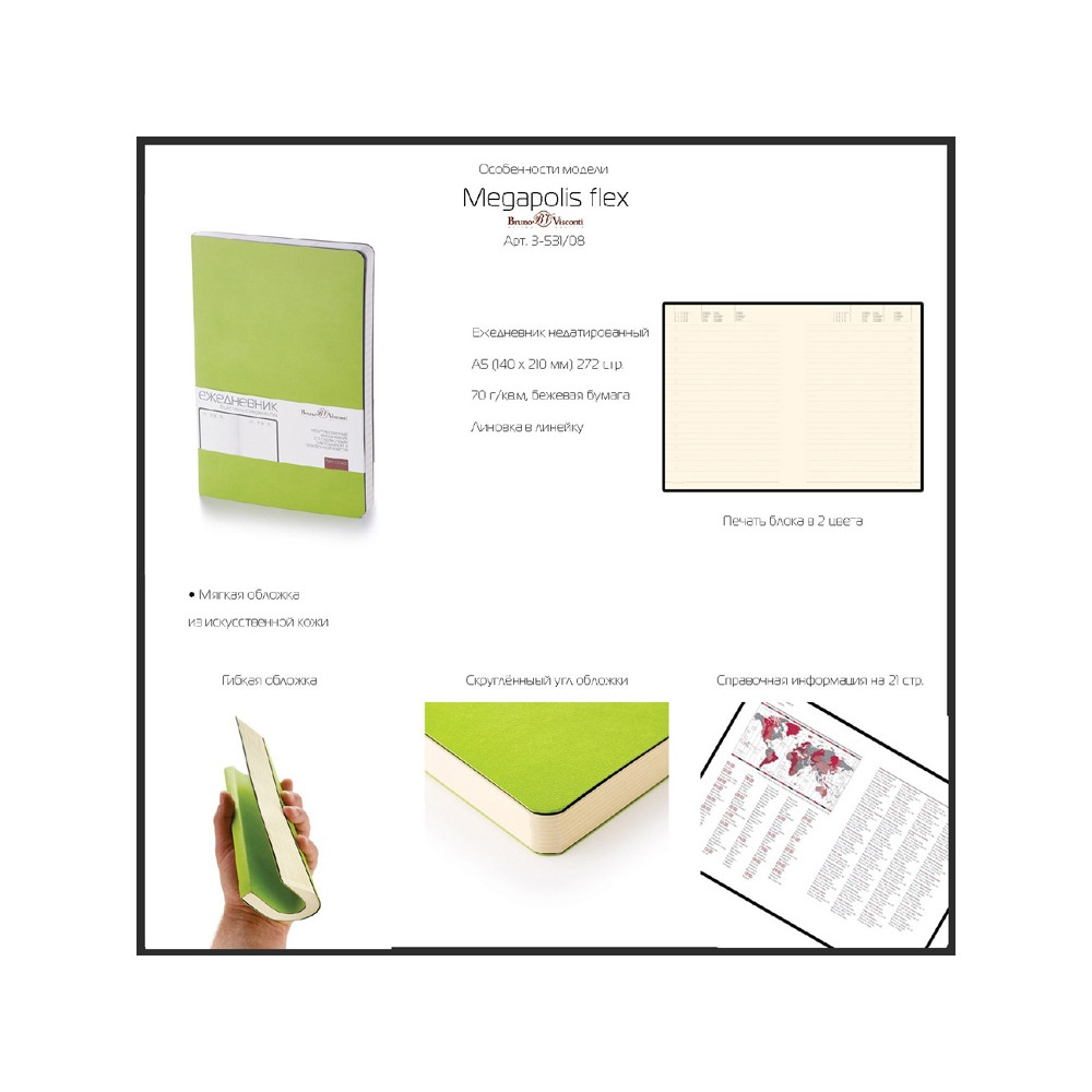 Недатированный ежедневник Megapolis Flex от бренда Bruno Visconti - это качественный корпоративный подарок по выгодной цене, произведенный специально под персонализацию. Представлен в универсальном формате А5 и состоит из 272 страниц. Элегантная закругленная flex обложка из гладкого кожзама имеет гибкую конструкцию и приятна на ощупь. А интегральный переплет позволяет сэкономить место в деловой сумке или портфеле – ежедневник можно просто свернуть в трубку или согнуть пополам. В ежедневнике Megapolis Flex есть полезная справочная информация и телефонная книга, а также страницы для записи идей, мыслей и составления рабочих планов. Для изготовления страниц используется качественный бежевый офсет повышенной плотности (70 г/кв м). Блок не привязан к конкретным датам – они указываются в выделенном поле вверху страницы. Тонированная бумага не дает глазам утомиться даже при длительной работе. Все ежедневники от бренда Bruno Visconti можно персонализировать с помощью тиснения обложки - золотой или серебряной фольгой. Наши ежедневники помогут быть успешным и эффективным в карьере и повседневной жизни!