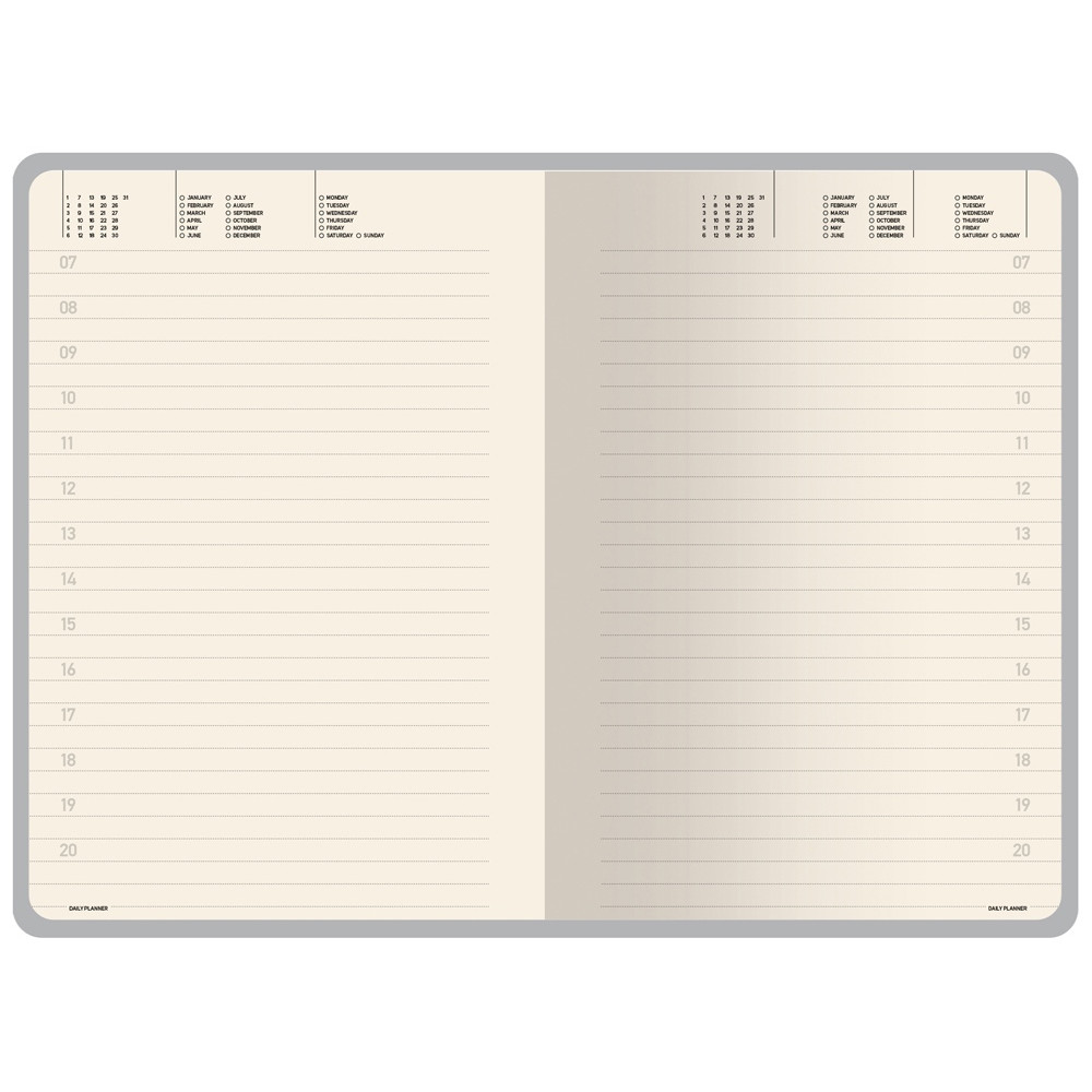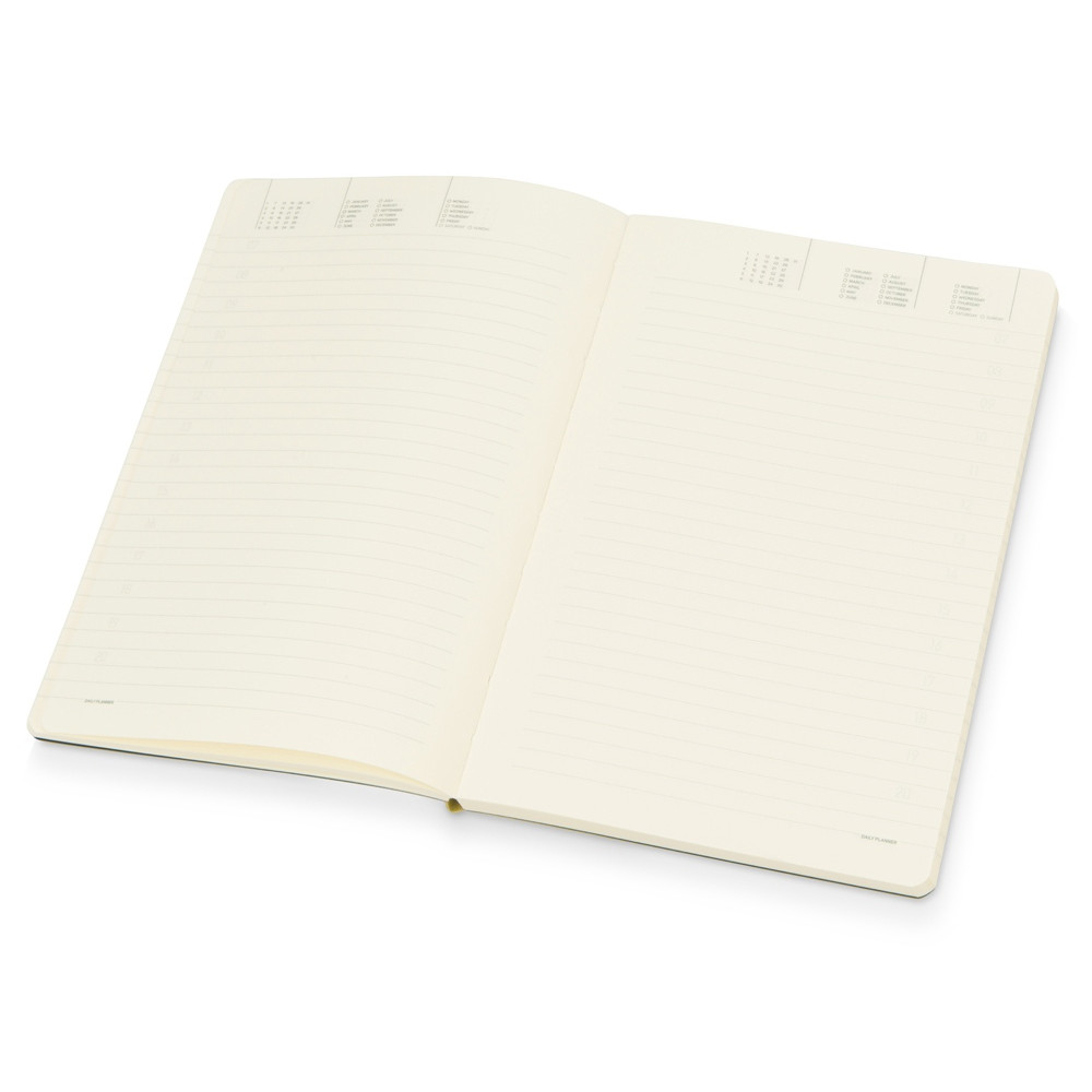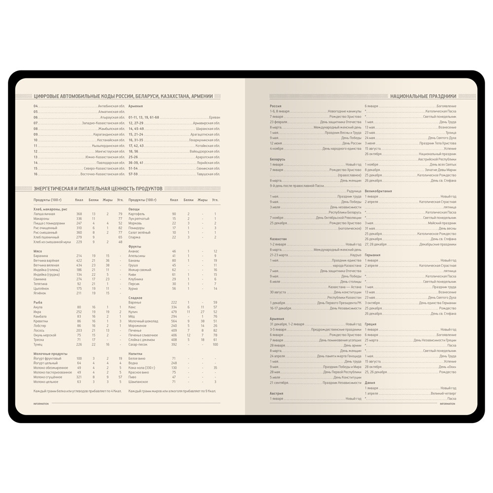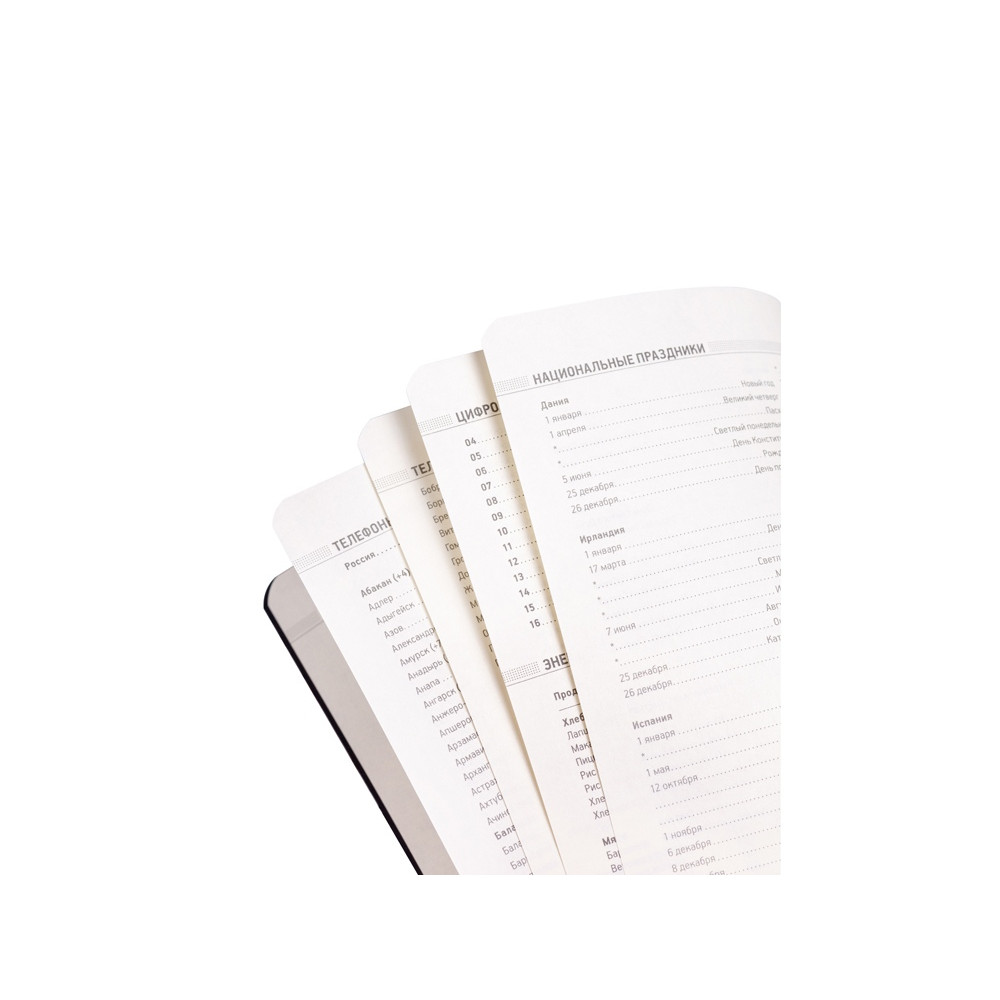В ежедневнике Megapolis Flex есть полезная справочная информация и телефонная книга, а также страницы для записи идей, мыслей и составления рабочих планов. Для изготовления страниц используется качественный бежевый офсет повышенной плотности (70 г/кв м). Блок не привязан к конкретным датам – они указываются в выделенном поле вверху страницы. Тонированная бумага не дает глазам утомиться даже при длительной работе.