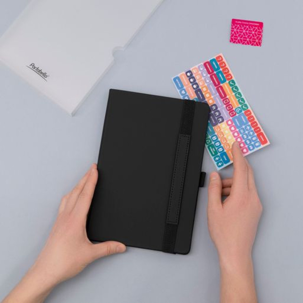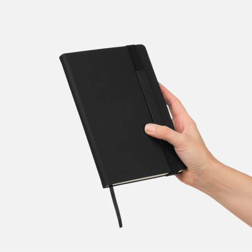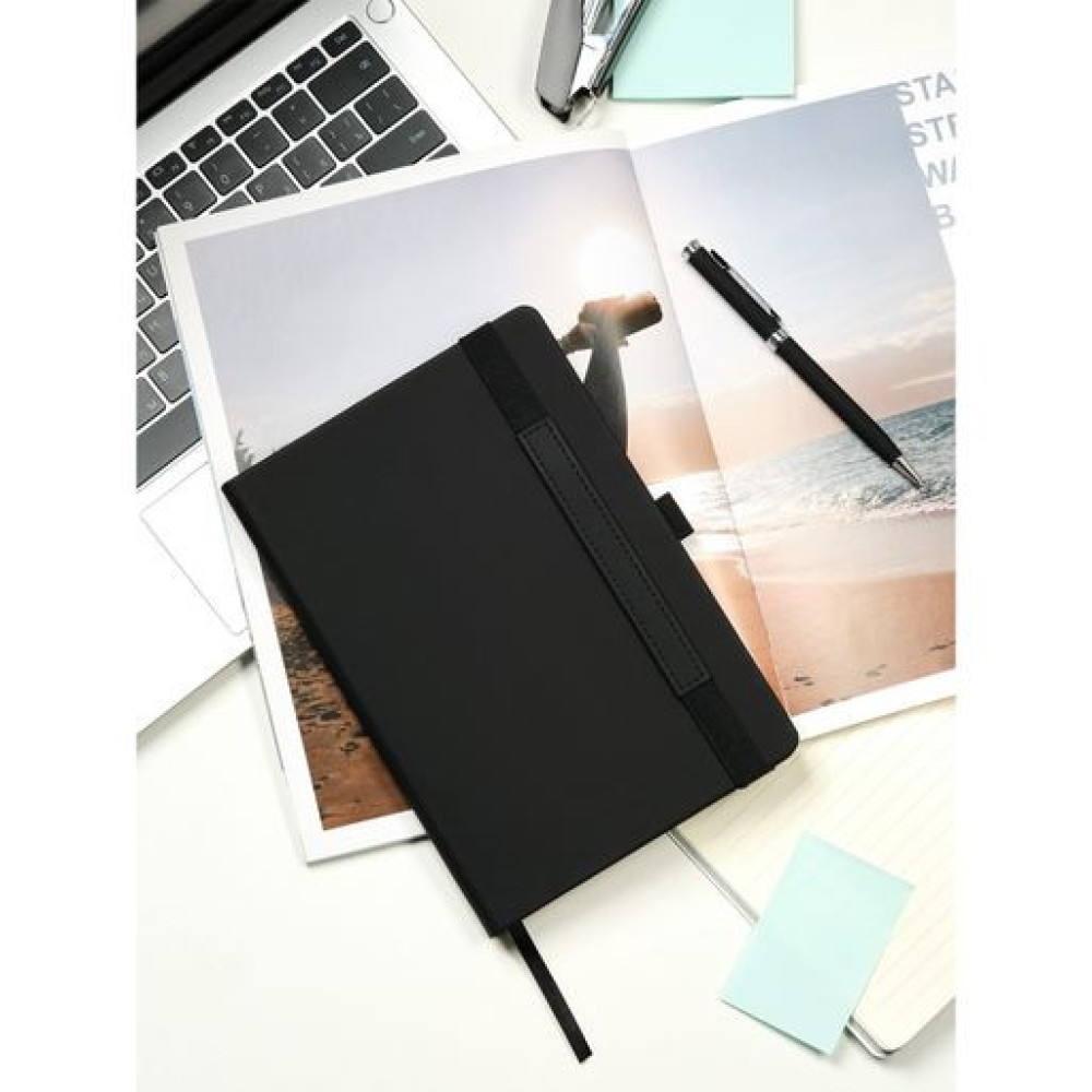 Вертикальная резинка-фиксатор с вставкой из ПУ-материала обложки и петелька под ручку, в цвет обложки