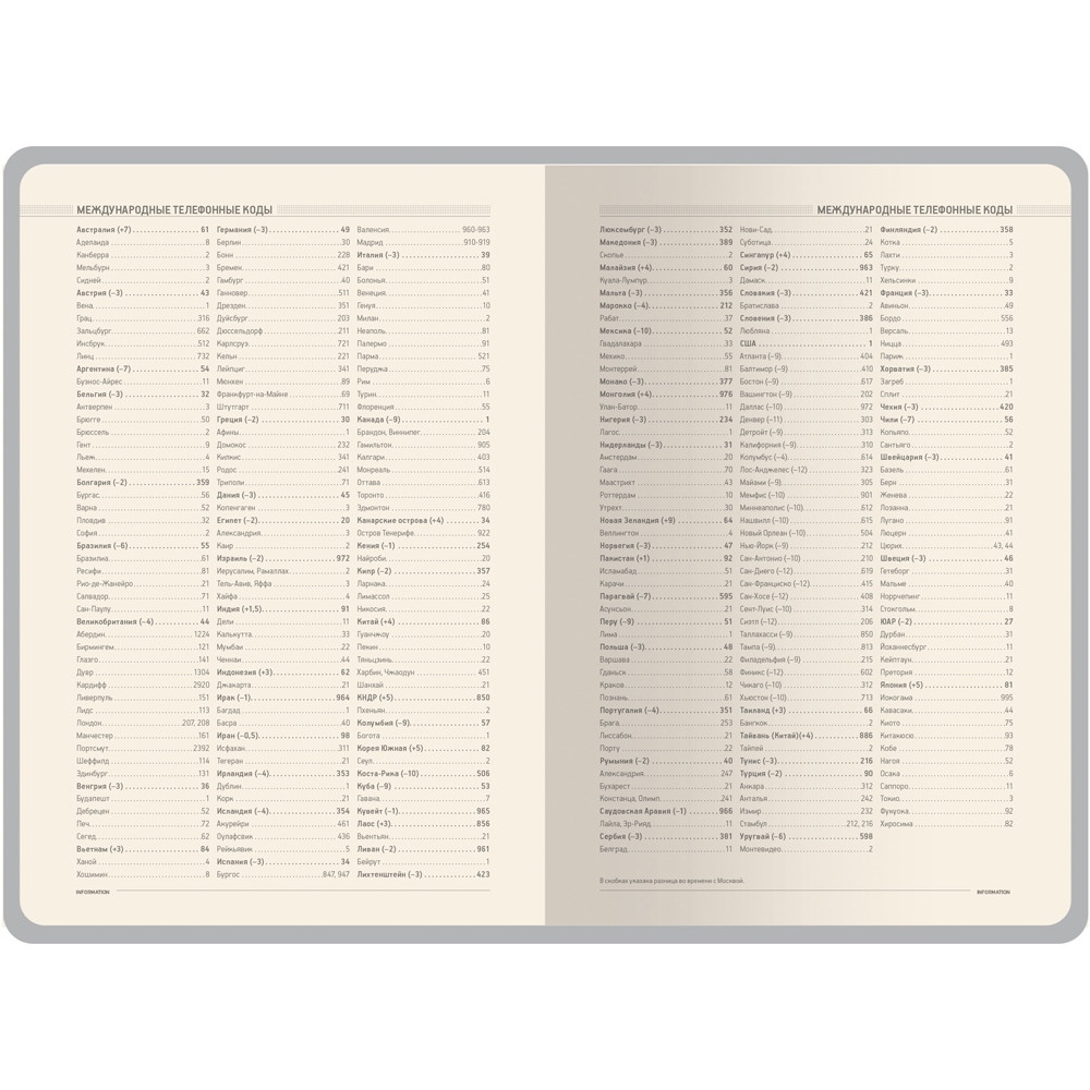 • 19 страниц справочной информации (телефонные коды, буквенные коды, города-миллионники, автомобильные коды, энергетическая и питательная ценность продуктов, национальные праздники, скорость, давление, температура, страны мира, единицы измерения, штрихкоды, термины международной торговли, греческие буквы, размеры одежды, формат бумаги, религиозные праздники, аэропорты Европы, допустимое содержание алкоголя в крови, время распада алкоголя в крови);
