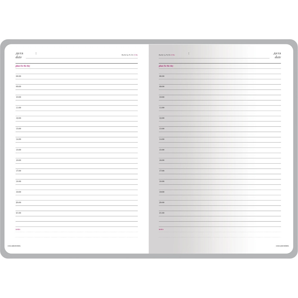 В ежедневнике Sidney Nebraska есть полезная справочная информация и телефонная книга на 18 листов, а также 272 страницы для записи идей, мыслей и составления рабочих планов. Для изготовления страниц используется качественный белый офсет повышенной плотности (70 г/кв м) с серебристым срезом, который производится в Японии и подходит для всех видов чернил. Разметка блока с указанием времени позволяет планировать дела с точностью до 1 часа.