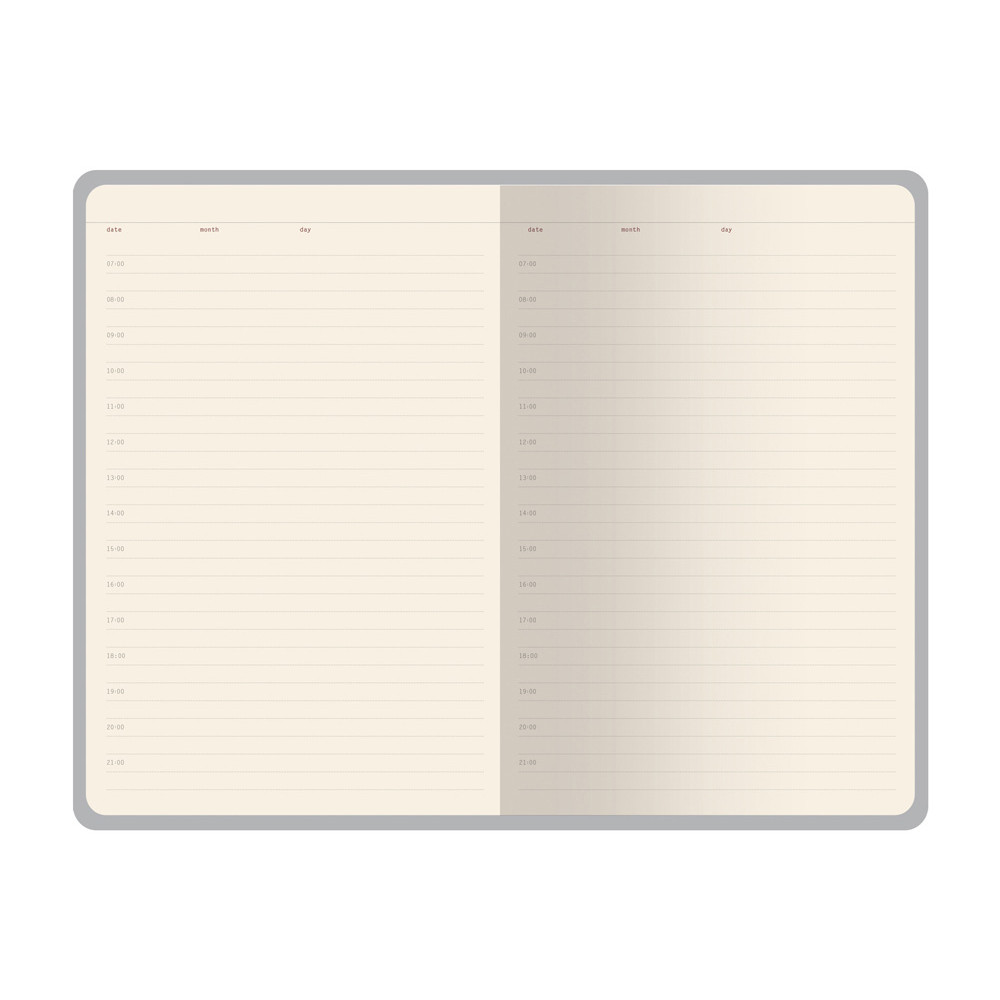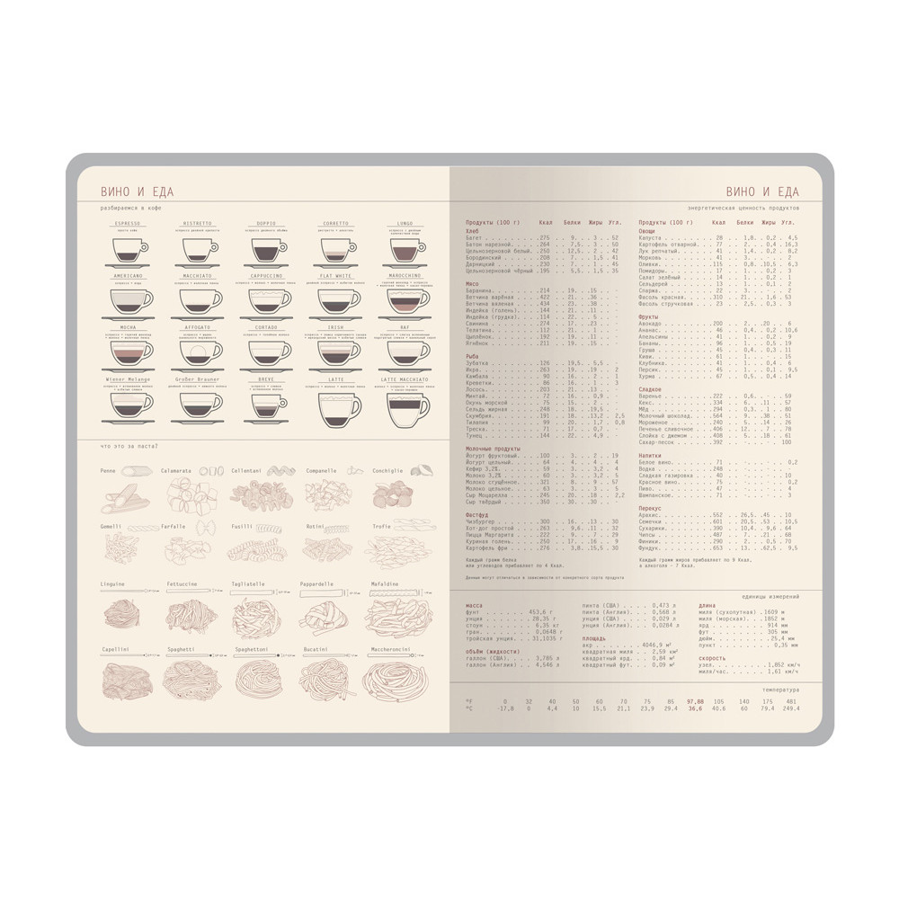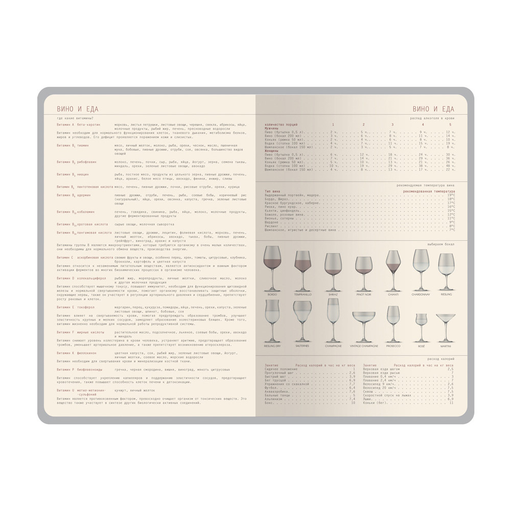 Ежедневник формата А5 имеет внутренний блок из 272 страниц. Блок изготовлен из бежевой бумаги плотностью 70 г/м2 и содержит: