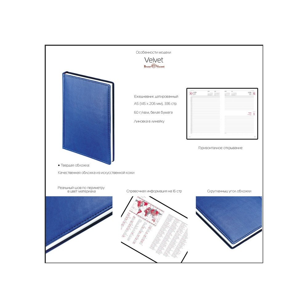 Недатированный ежедневник A5 Velvet в линейку от бренда Bruno Visconti - это качественный корпоративный подарок по выгодной цене, произведенный специально под персонализацию. Представлен в универсальном формате А5. В нем есть полезная справочная информация и телефонная книга, а также 272 страницы для записи идей, мыслей и составления рабочих планов.