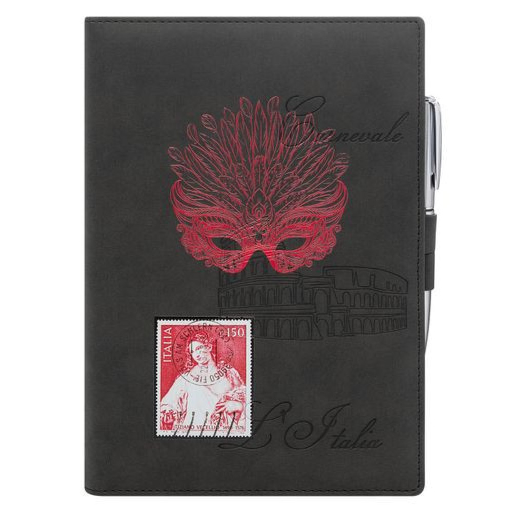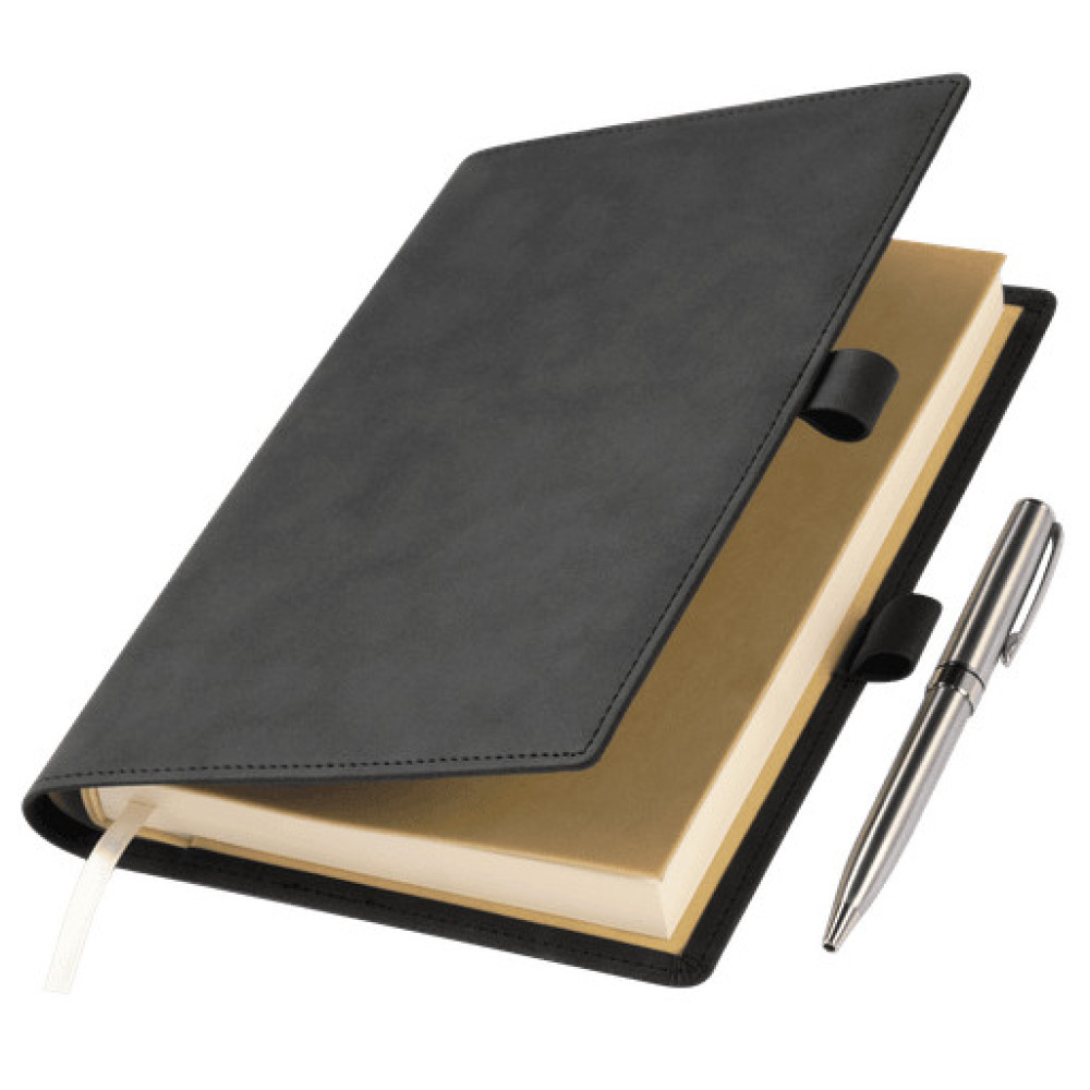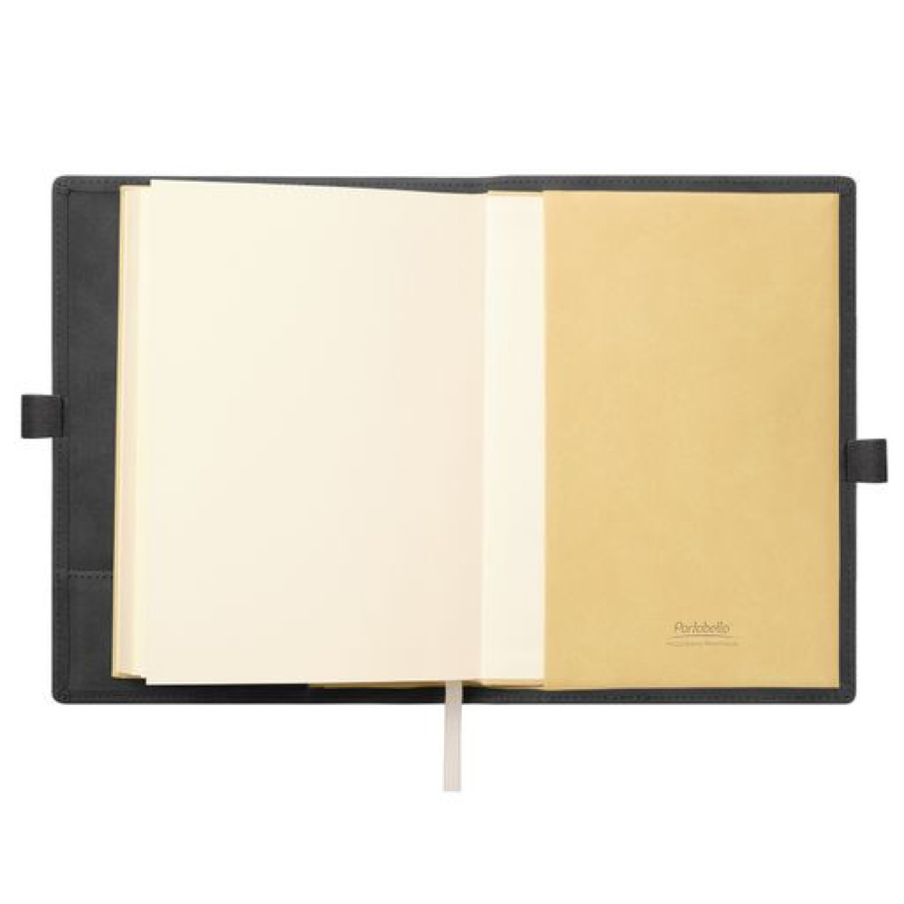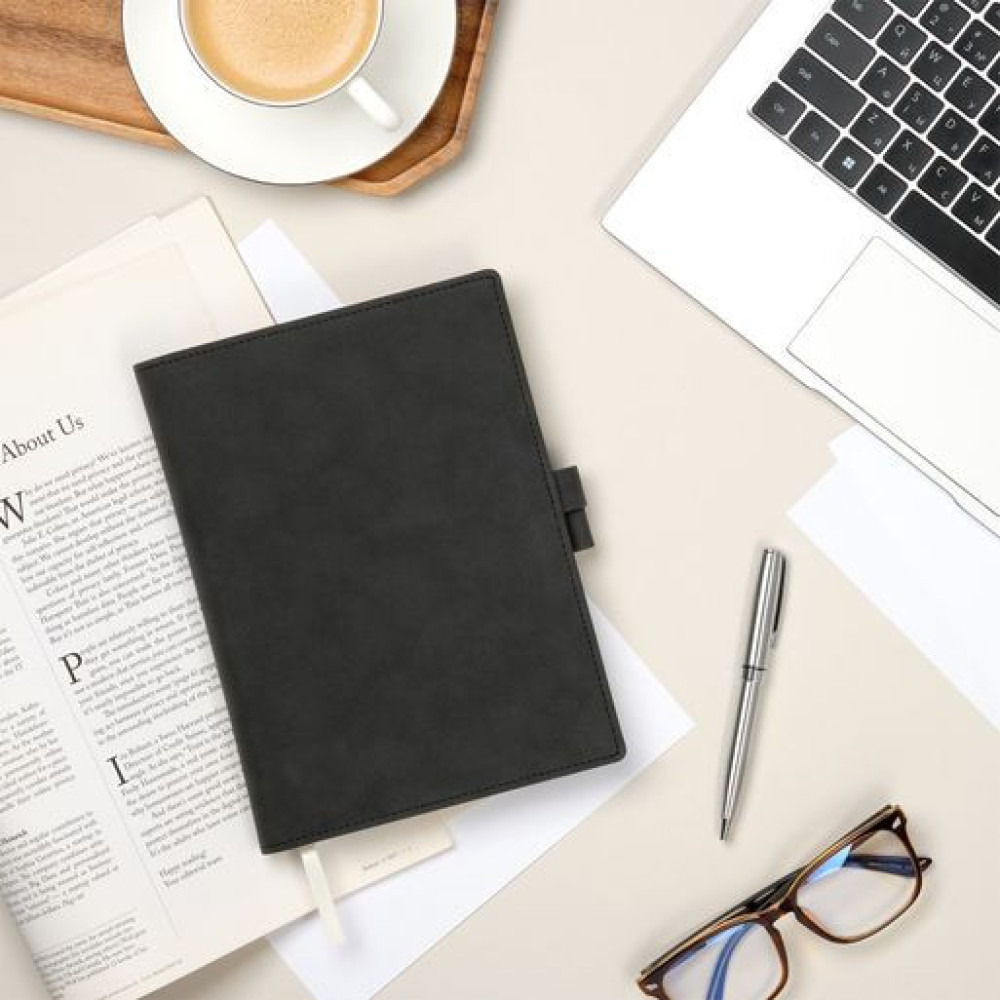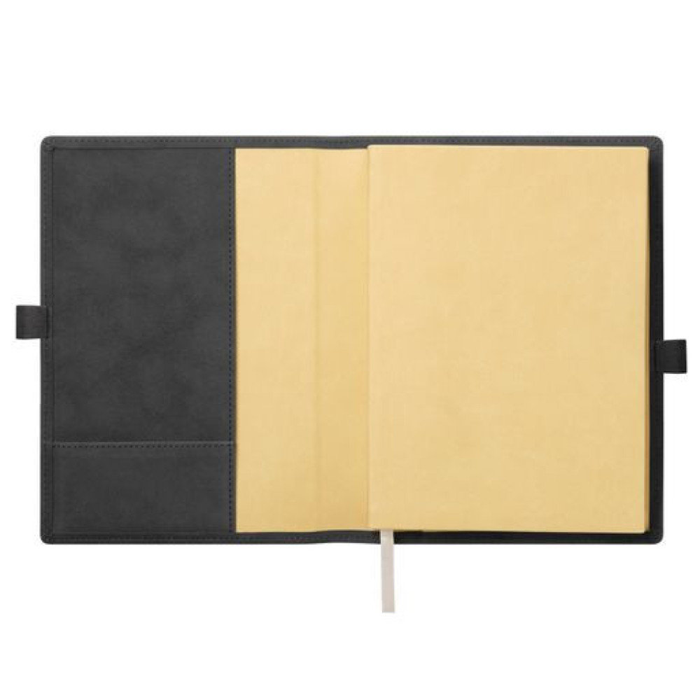 Застежка составлена из двух петель для ручки из материала и цвета обложки, расположенных на ее противоположных сторонах.