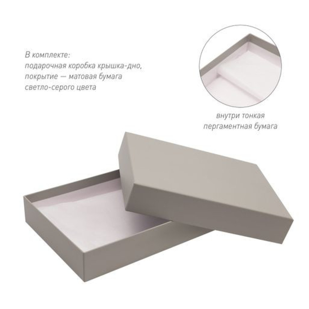 Упаковка: подарочная коробка крышка-дно светло серого цвета. Внутри дополнительная упаковка в тонкую пергаментную бумагу.