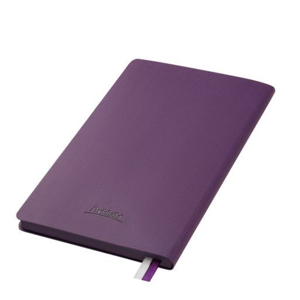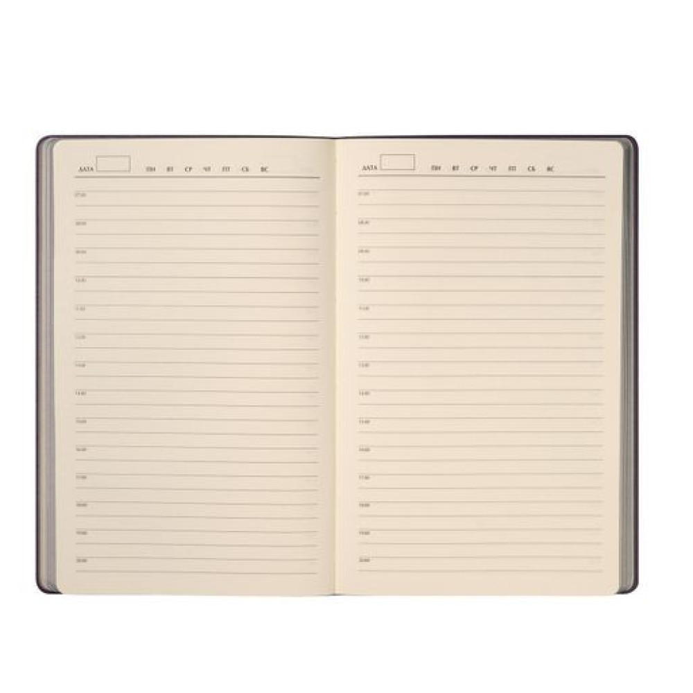Недатированный ежедневник отличается современным технологичным дизайном и оригинальным цветовым ансамблем. Гибкая матовая обложка со скругленными уголками выполнена из искусственной кожи, имитирующей покрытие в стиле Hi-Tech. Переплетный материал с вертикальным рифлением, бархатистый, со слегка прорезиненным эффектом. За счет интересной рельефной фактуры прослеживается игра цвета при перемене освещения. Цвет – фиолетовый, насыщенный, плотный, однородный. Создает органичный природный тандем с матовыми форзацем и нахзацем серого цвета. Срез матовый, в тон обложки. Страницы со скругленными уголками приятного глазу теплого светло-кремового цвета. Выполнены из гладкого шелковистого офсета. Ежедневник дополнен двойным атласным ляссе из лент серого и фиолетового цветов, имеющих глянцевый отлив.