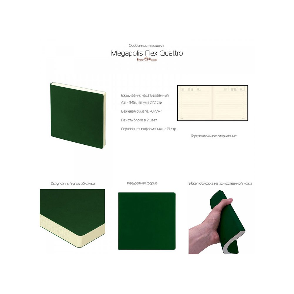Оригинальный формат ежедневника Megapolis Flex Quattro никого не оставляет равнодушным. Большинство покупателей влюбляются в него с первого взгляда. Обложка выполнена из качественного, тактильно приятного искусственного материала, гибкая и не ломкая. Великолепная бежевая бумага плотностью 70 г/м и практичная линовка с расписанным временем для планирования дел. Этот ежедневник отлично поместится даже в маленькую сумку, а у всех, кто его увидит вызовет неподдельный восторг. Справочная информация на 19 страницах и телефонная книга на 28. Удобно, практично и, конечно же, стильно!
