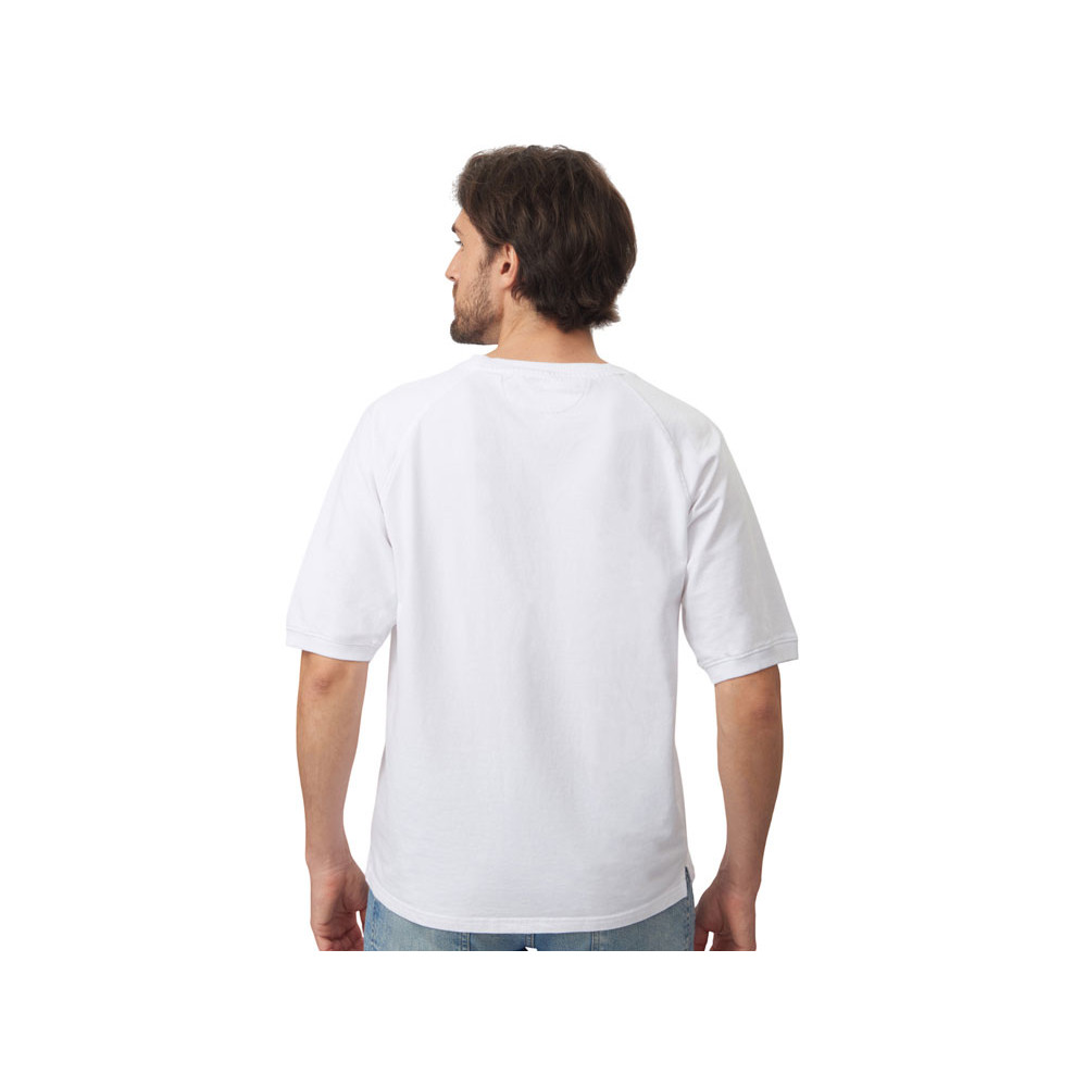 Футболка выполнена из хлопкового френч терри с петельками на изнаночной стороне. Горловина обработана рибом 2х2 и дополнительно усилена тесьмой-елочкой с внутренней стороны спинки и дополнена кокеткой по спинке для нанесения логотипа клиента. Рукав реглан продублирован рибом по низу. Разрезы в боковых швах. Гладкая поверхность полотна позволяет идеально нанести изображение. Футболка комфортного силуэта.