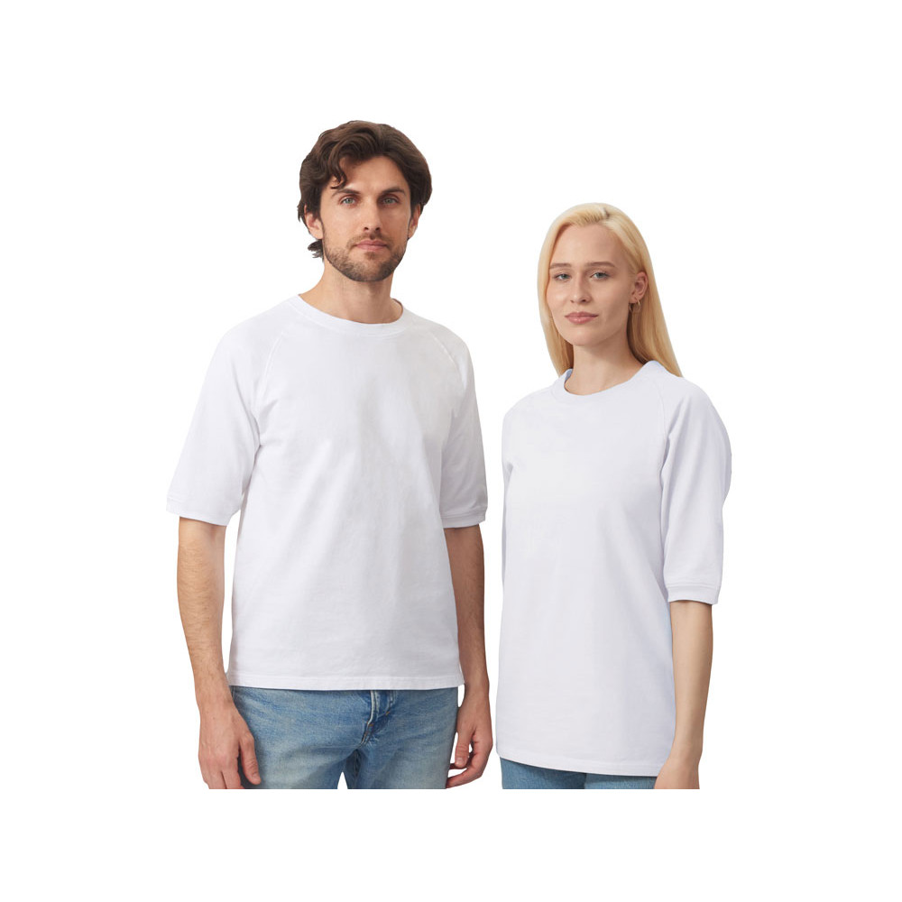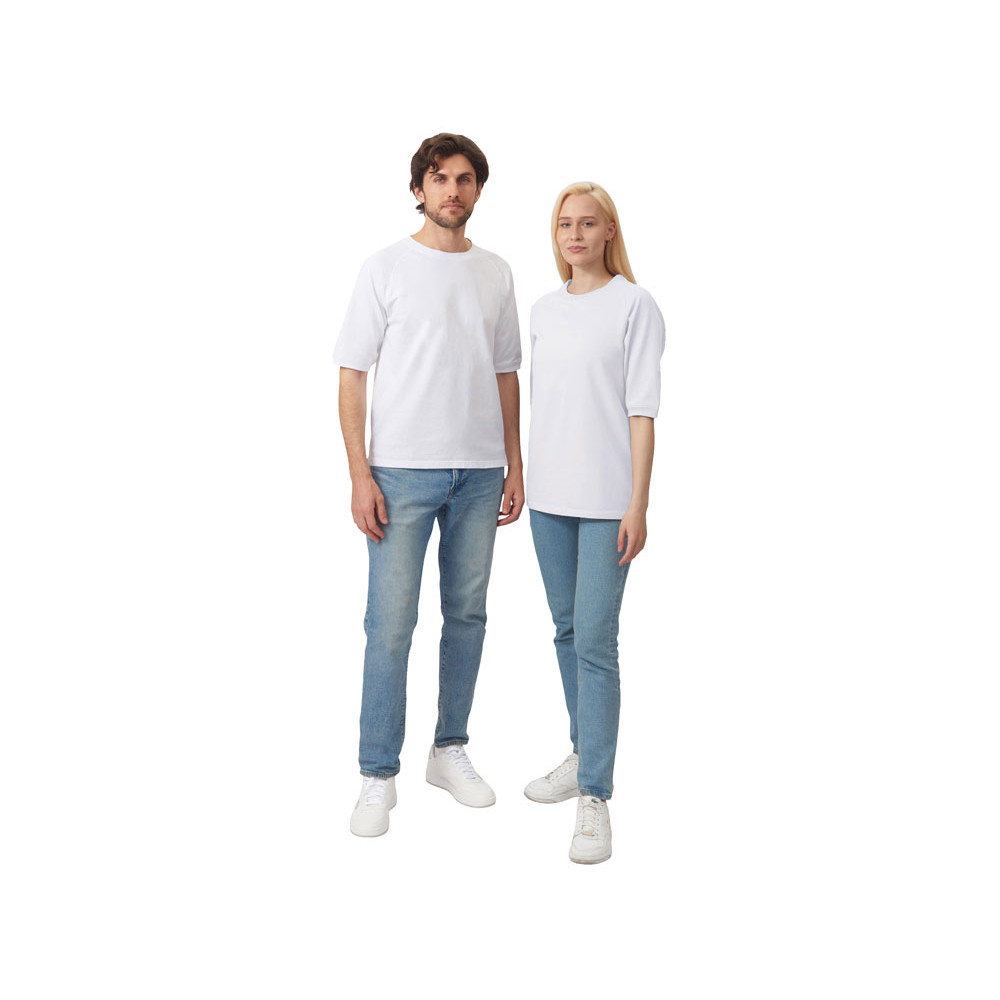 Футболка выполнена из хлопкового френч терри с петельками на изнаночной стороне. Горловина обработана рибом 2х2 и дополнительно усилена тесьмой-елочкой с внутренней стороны спинки и дополнена кокеткой по спинке для нанесения логотипа клиента. Рукав реглан продублирован рибом по низу. Разрезы в боковых швах. Гладкая поверхность полотна позволяет идеально нанести изображение. Футболка комфортного силуэта.