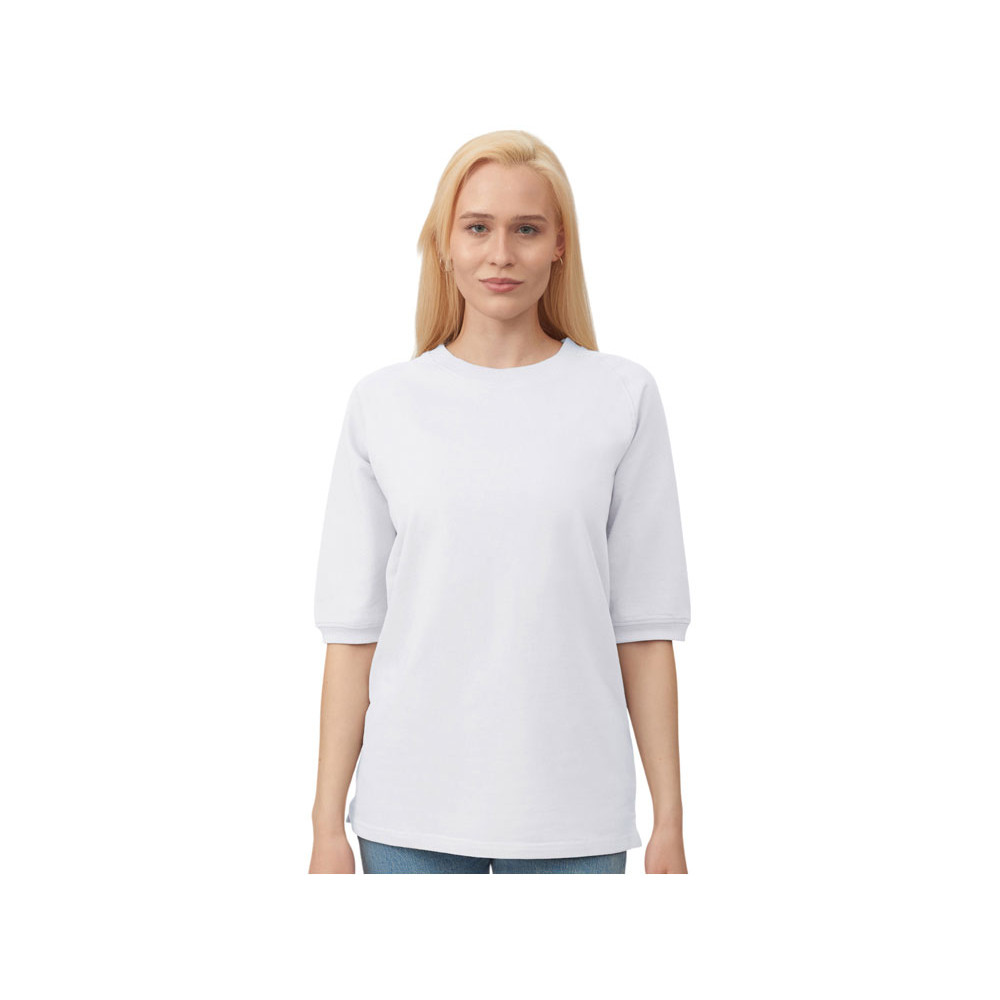Футболка выполнена из хлопкового френч терри с петельками на изнаночной стороне. Горловина обработана рибом 2х2 и дополнительно усилена тесьмой-елочкой с внутренней стороны спинки и дополнена кокеткой по спинке для нанесения логотипа клиента. Рукав реглан продублирован рибом по низу. Разрезы в боковых швах. Гладкая поверхность полотна позволяет идеально нанести изображение. Футболка комфортного силуэта.