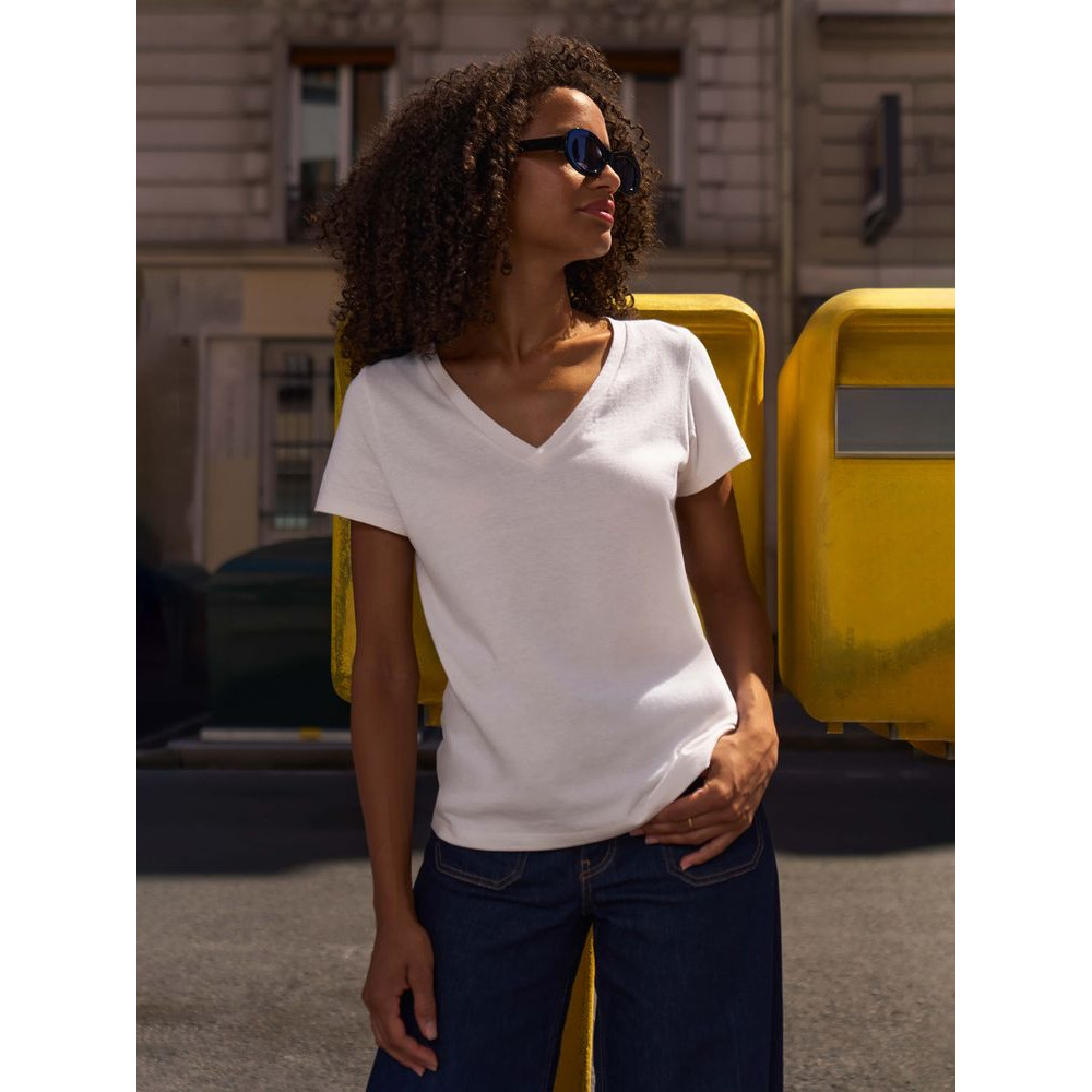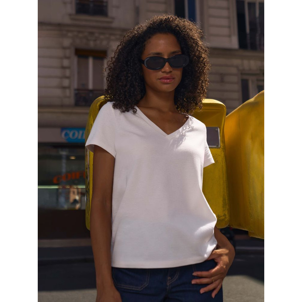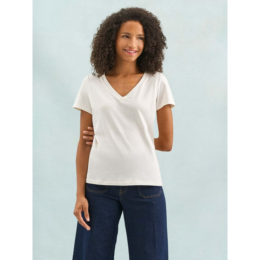 Женская футболка Regent с V-образным вырезом. Такой вырез снова актуален: он визуально удлиняет шею, подчеркивает линию ключиц и добавляет образу легкости.