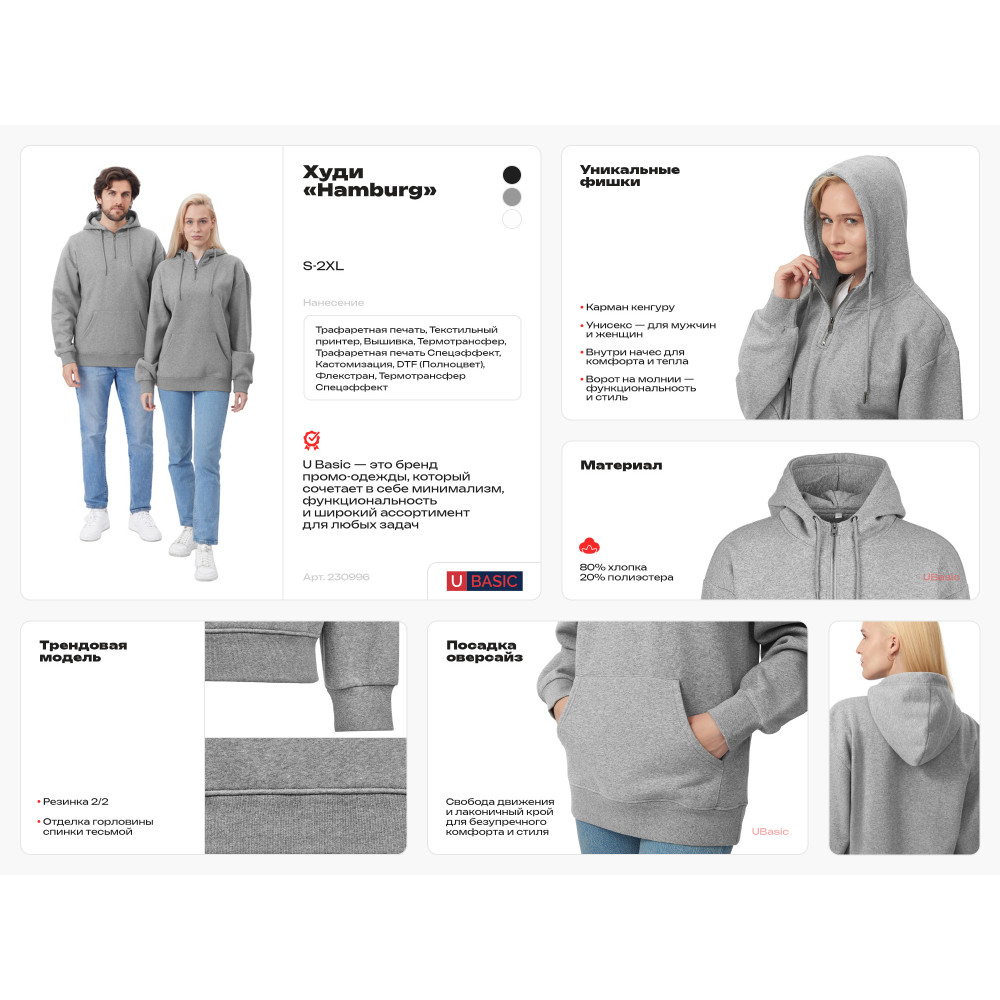 Худи с капюшоном ворот на молнии. Шнур в капюшоне с металлическими наконечниками. Отделка горловины спинки внутри тесьмой, Риб 2х2 по низу изделия и манжетам. Удобный карман кенгуру.