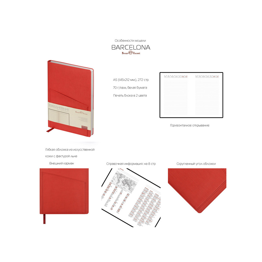 Это ежедневник предназначен для тех, кто отдает предпочтение строгости. Телефон, ручка, визитки и листы для записей будут всегда под рукой благодаря удобному карману на фронтальной стороне. В недатированном ежедневнике Barcelona черного цвета используется белая бумага плотность 70 г/м. Ляссе благородного бордового цвета сочетается с обложкой. Скругленный угол - фирменная особенность ежедневников Bruno Visconti. Справочная информация на 8 страницах. Ежедневник Barcelona упаковывается в картонный полукороб и термопленку.