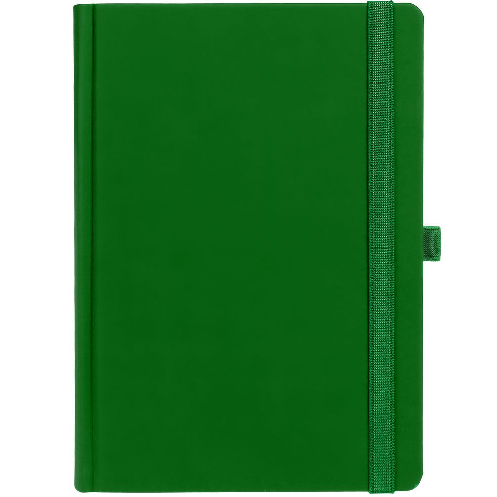 Ежедневник с твердой обложкой без поролона, выполнен из материала Soft Touch Ultra, зеленый FF, дополнен резинкой шириной 1 см, петлей-резинкой для ручки, капталом и ляссе ярко-зеленого цвета.