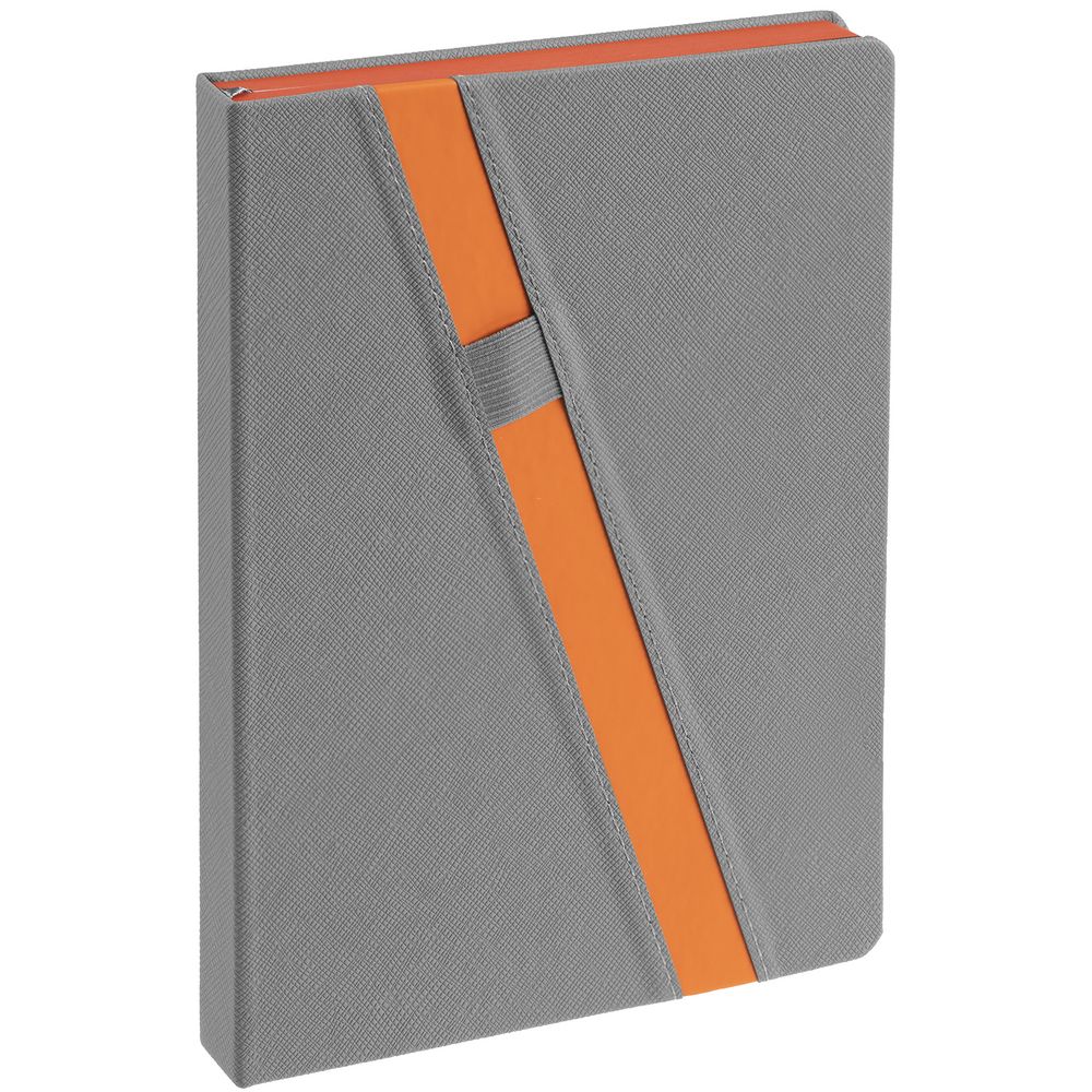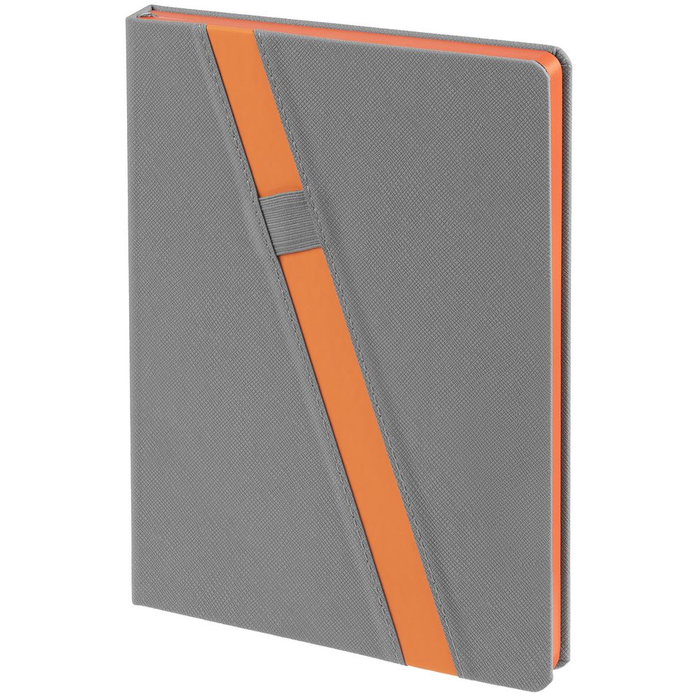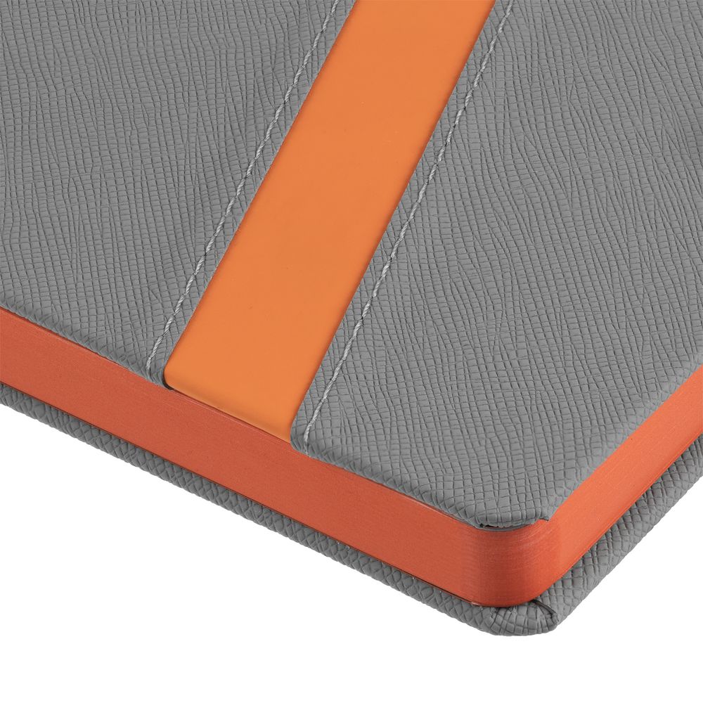 Ежедневник с твердой обложкой и тонированным обрезом. Выполнен из материала Nice Touch, серый СС, и Soft Touch, оранжевый ОО, дополнен серым ляссе.