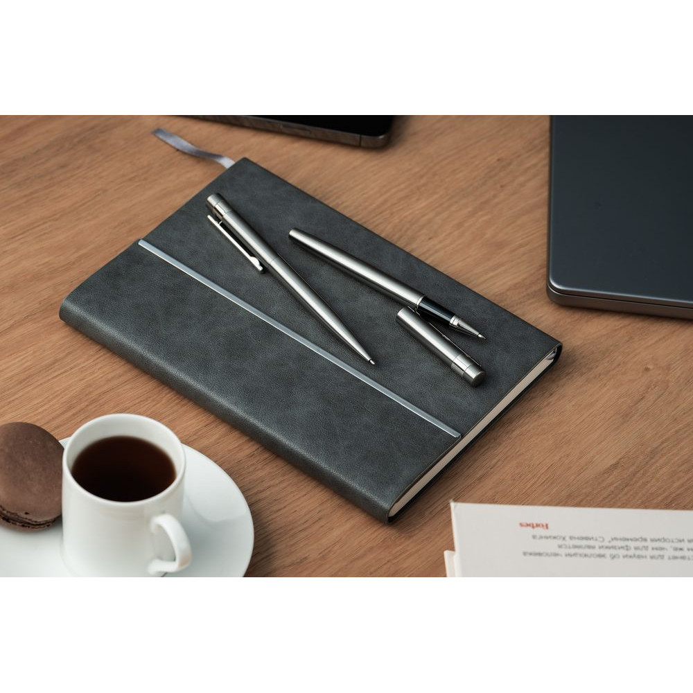 Ежедневник с гибкой обложкой, клапаном на магните и металлической отделкой клапана. Выполнен из материала Petrus, серый СС, дополнен серым ляссе.