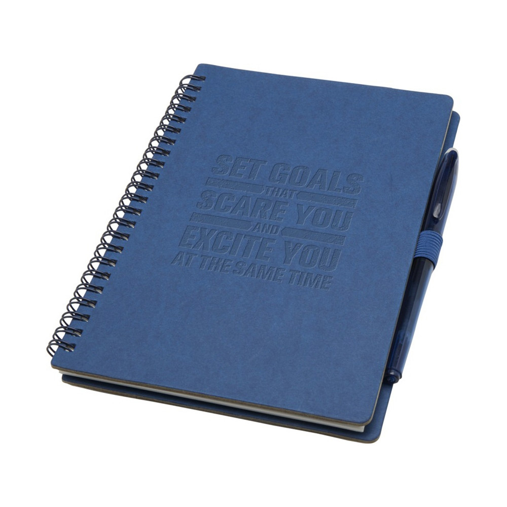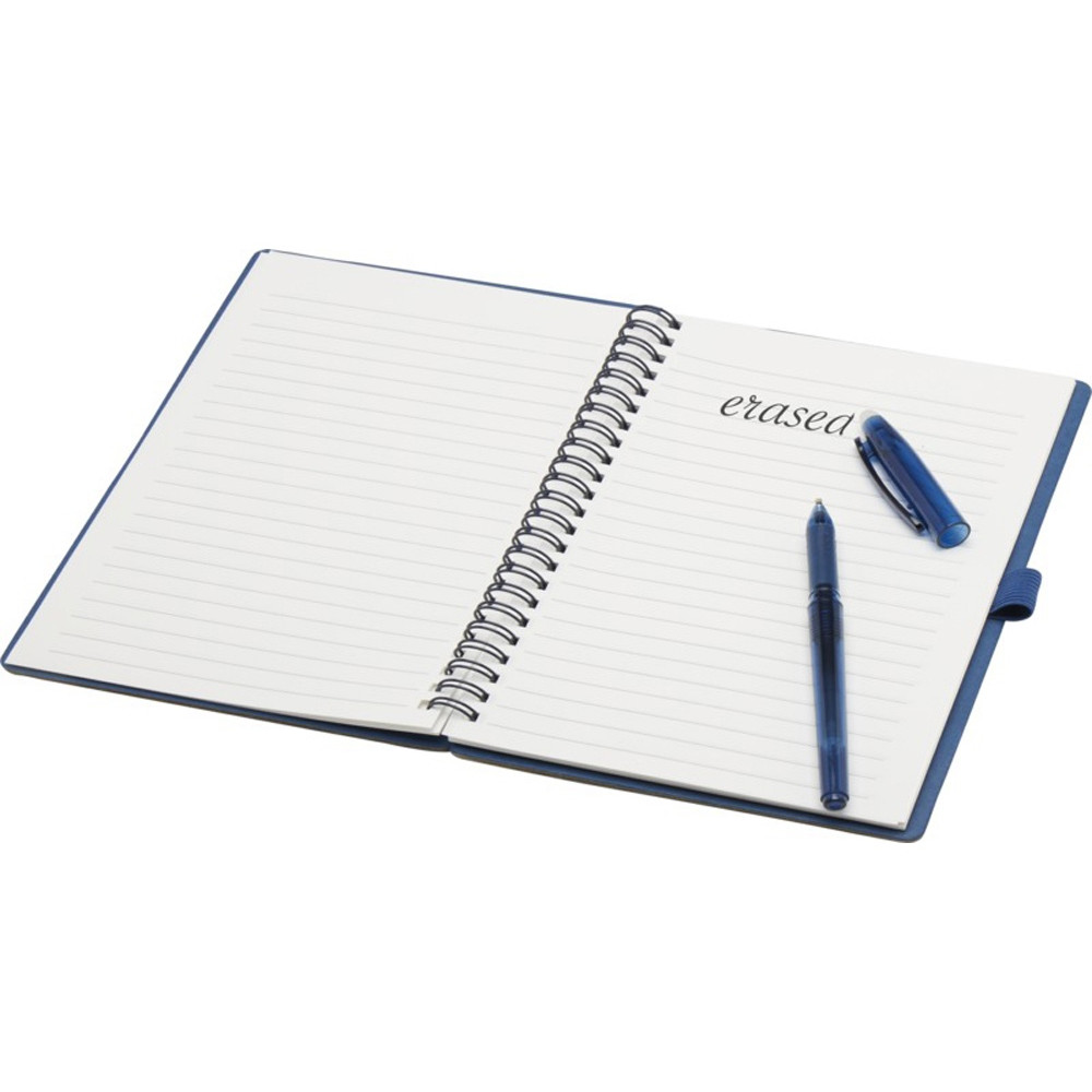Многоразовый набор из ручки и блокнота в мягкой обложке из каменной бумаги. Блокнот имеет обложку из картона, закругленные углы и 32 листа линованной бумаги плотностью 120 г/м². В производстве каменной бумаги не используется дерево, а на сам процесс изготовления затрачивается гораздо меньше энергии в сравнении с производством переработанной или целлюлозной бумаги. Сзади имеется карман для хранения черной протирочной ткани (входит в комплект). Ручка из переработанного пластика с стираемыми чернилами, прозрачным корпусом, белым ластиком сверху и однотонной цветной рукояткой. Цвет чернил: черный. Длина непрерывной линии: 250 метров. Размер пера: 0,7 мм.