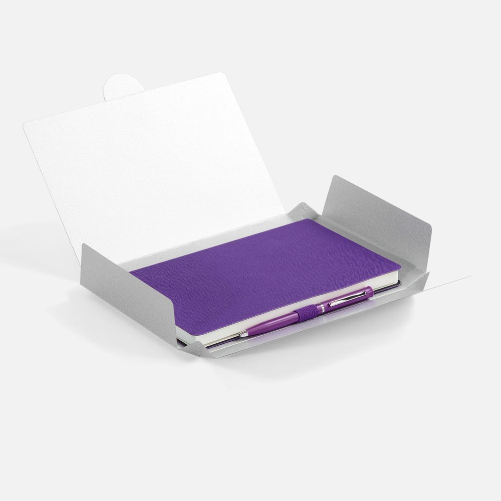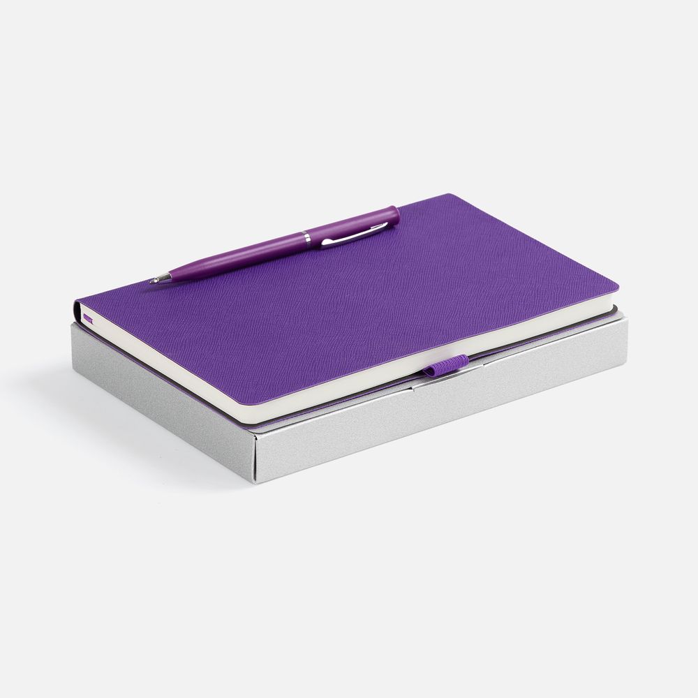 Зауженный ежедневник и ручка комплементарного оттенка в простой лаконичной коробке — готовое предложение делового подарка для сотрудников и партнеров.