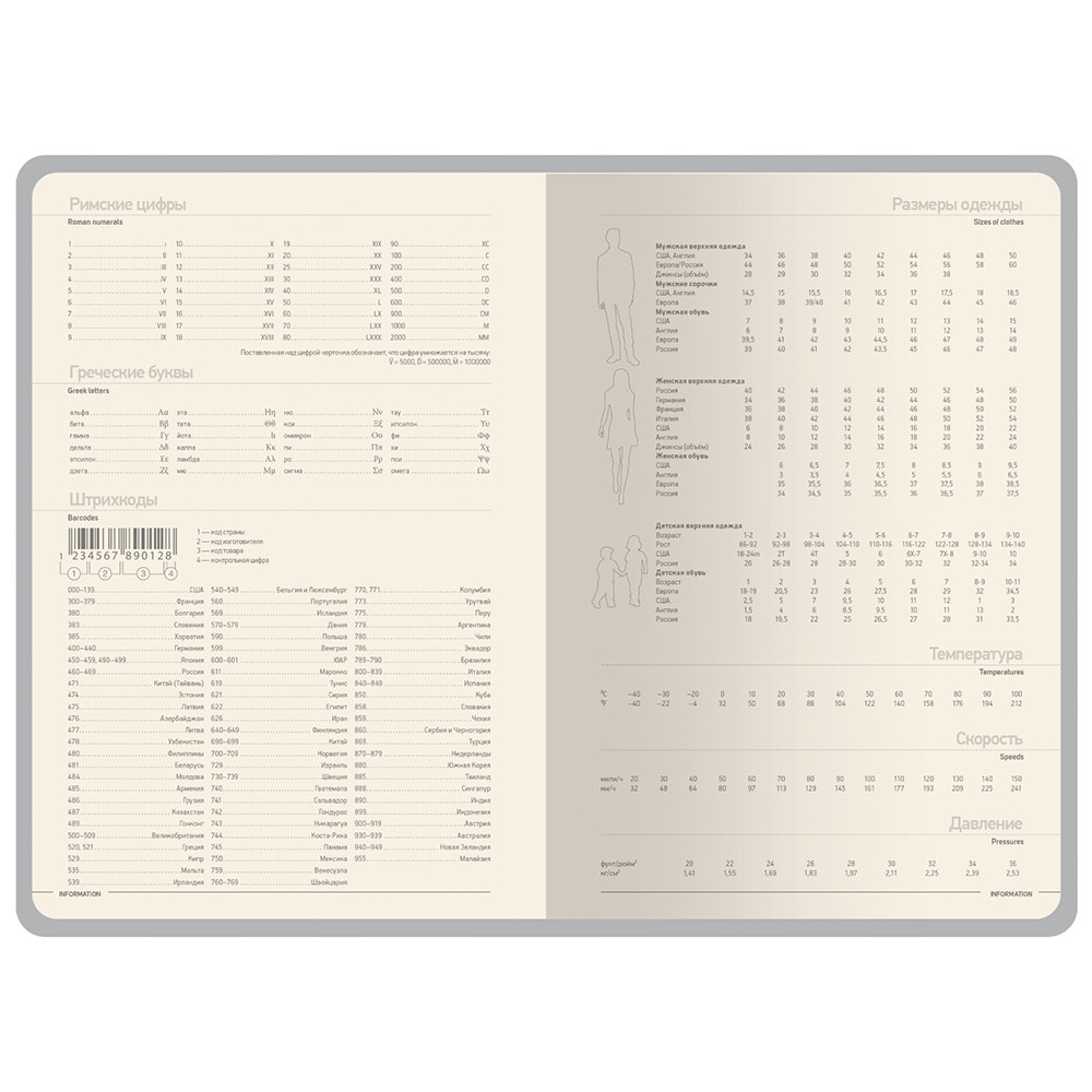 Недатированные страницы в серую линейку имеют отдельное место для проставления числа месяца и дня недели. Справочный блок на 17 страницах содержит полезную информацию из различных областей.
