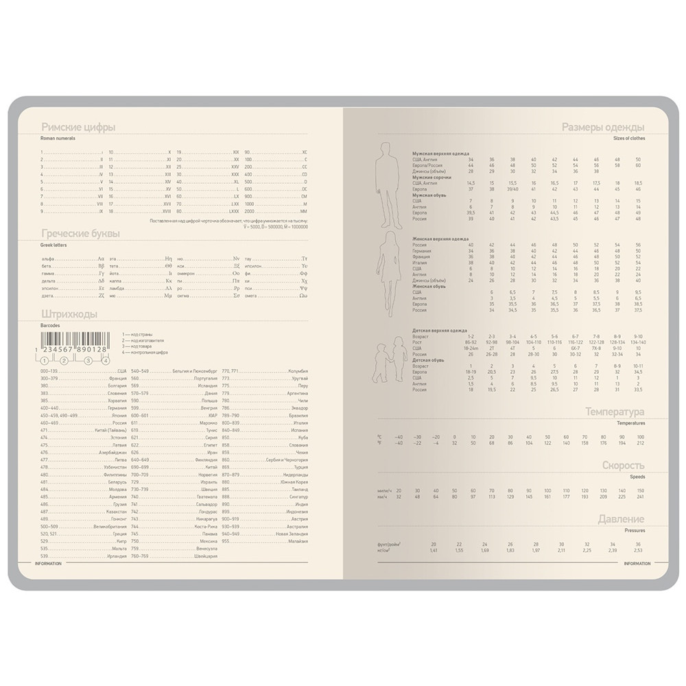 Недатированные страницы в серую линейку имеют отдельное место для проставления числа месяца и дня недели. Справочный блок на 17 страницах содержит полезную информацию из различных областей.