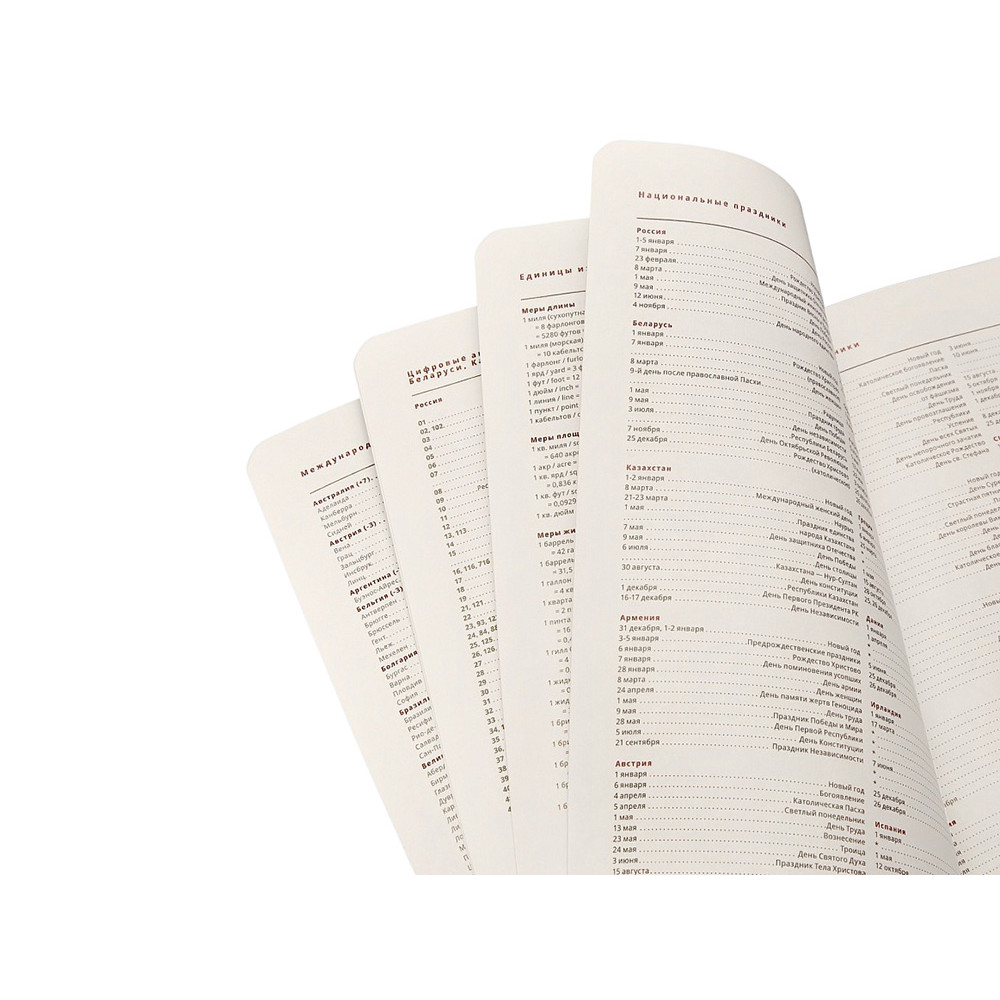 Недатированный ежедневник PARLIAMENT формата A5 в твердом переплете – элегантный деловой аксессуар, подчеркивающий статус владельца с продуманным до мелочей функционалом: - твердая обложка из высококачественной экокожи с декоративной нитью по периметру в тон ежедневника; - серебряный срез, контрастирующий с цветом обложки; - скругленные перфорированные углы блока и двойное ляссе для удобства навигации; - внутренний блок с увеличенным количеством страниц - 352, содержит несколько разделов: - страница для персональных данных; - раздел справочной информации на 17 страницах (часовые пояса, аэропорты Европы, международные телефонные коды, размер одежды, телефонные коды России, Беларуси, Казахстана, Армении, цифровые автомобильные коды, римские цифры, расход калорий при физической нагрузке, формат бумаги, десятичные приставки, единицы измерения, греческие буквы, штрихкоды, время распада алкоголя в крови, города-миллионники, национальные праздники, термины международной торговли, температура, скорость, давление, буквенные коды стран, энергетическая и питательная ценность продуктов, страны мира, заметки); - раздел для планирования с разлинованными листами и указанием времени с интервалом в один час; - картонный слив-бокс.