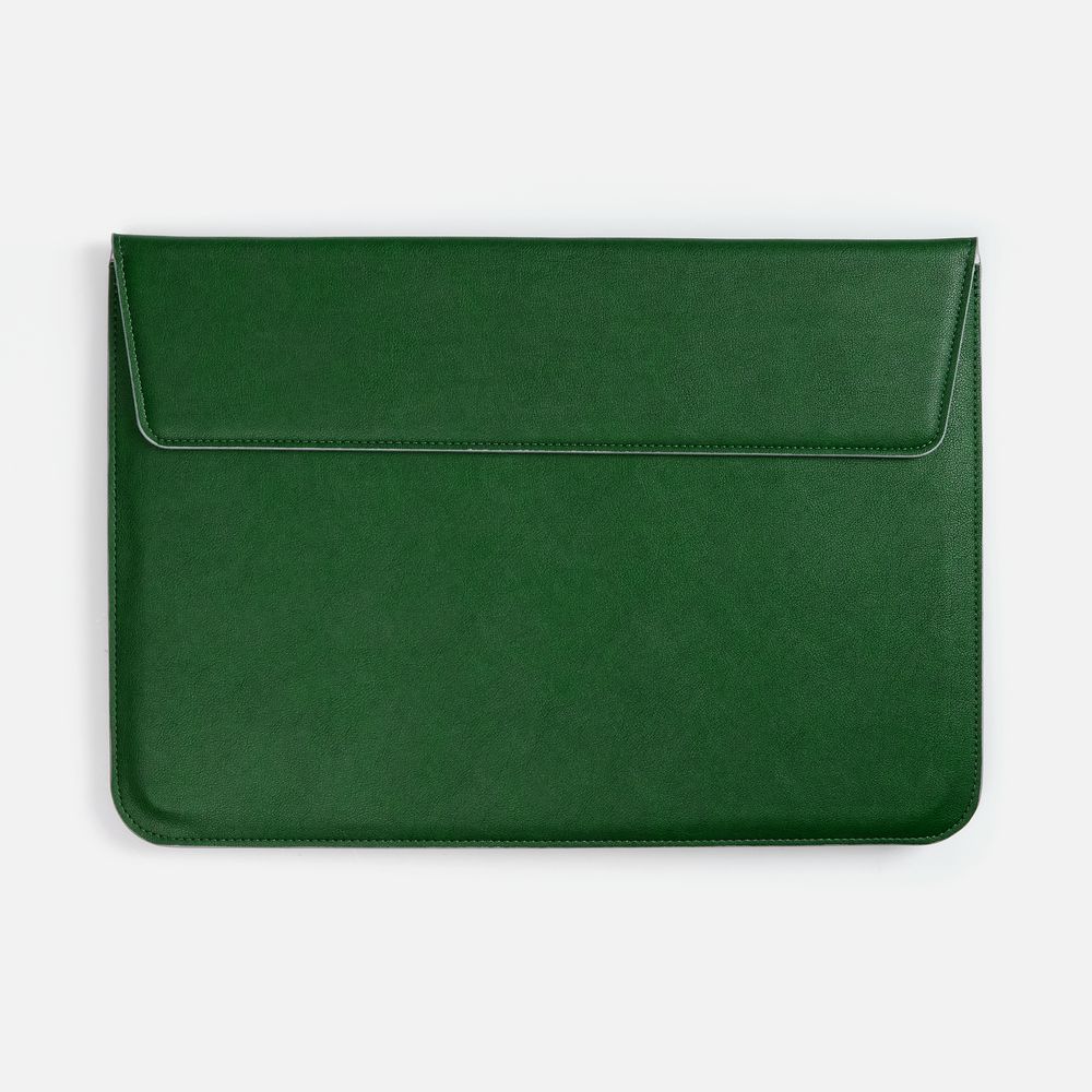Чехол для ноутбука с диагональю до 15,6 выполнен из материала Petrus, зеленого цвета, дополнен окрашенным срезом края серого цвета.