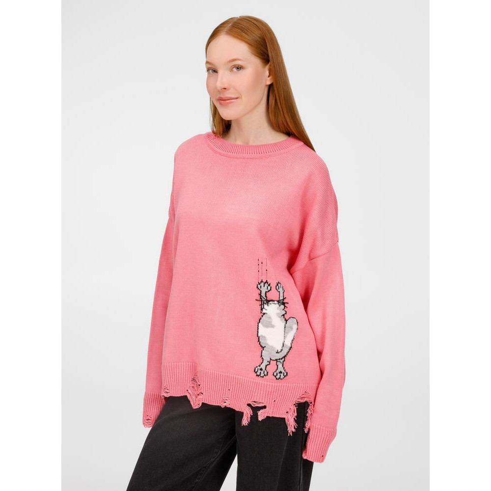 В дизайне мягкого джемпера с круглым вырезом Sharpick гранж-эстетика органично сочетается с милым акцентом — пушистым рисунком в виде озорного котика. Получается веселая вариация на тему того, откуда берется модная рваная одежда, а джемпер моментально создает настроение легкой несерьезности. Рваные края изделия добавляют современную нотку, а резинка на вороте, манжетах и по низу обеспечивает удобную посадку.