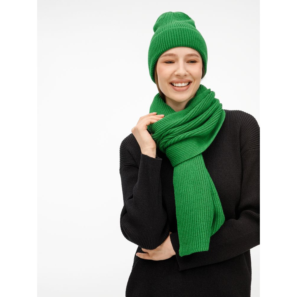 Удлиненная шапка с широким отворотом и фактурной вязкой мягко облегает голову, создавая элегантный силуэт. Широкий шарф с выразительным рельефом позволяет экспериментировать с драпировками, добавляя образу объем и динамику. Перчатки с аккуратной резинкой на манжете обеспечивают идеальную посадку и тактильный комфорт.