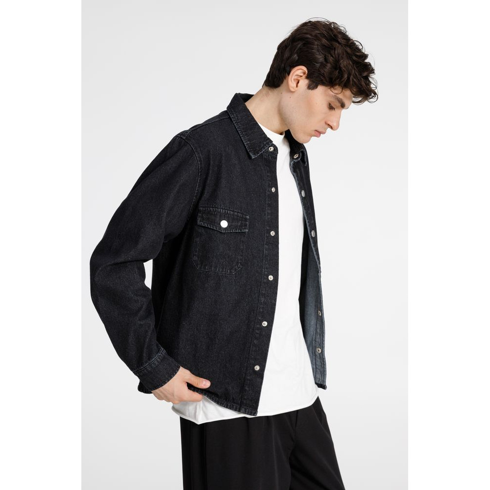 Джинсовая куртка-рубашка унисекс на кнопках прямого силуэта.