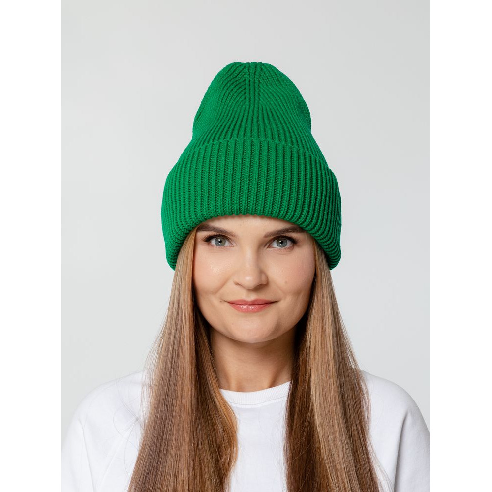 Удлиненная шапка объемной фактурной вязки с отворотом.