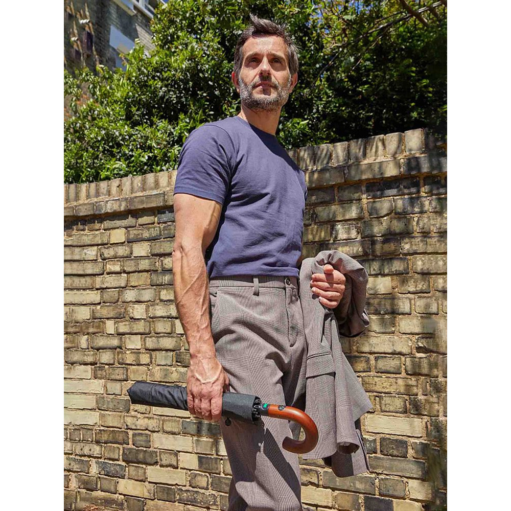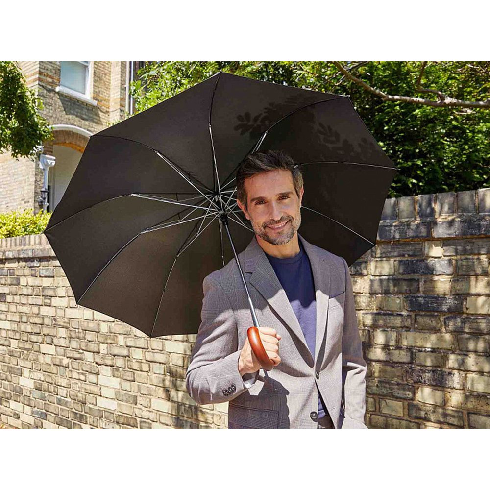 Идеальная модель для тех, кто не задается целью найти легкий и короткий складной зонт-«механику», а скорее обрадуется старому доброму увесистому и основательному полуавтомату. У модели ветроустойчивая конструкция. Рукоять выполнена из массива дерева и благодаря натуральности материала невероятно комфортно ощущается ладонью.