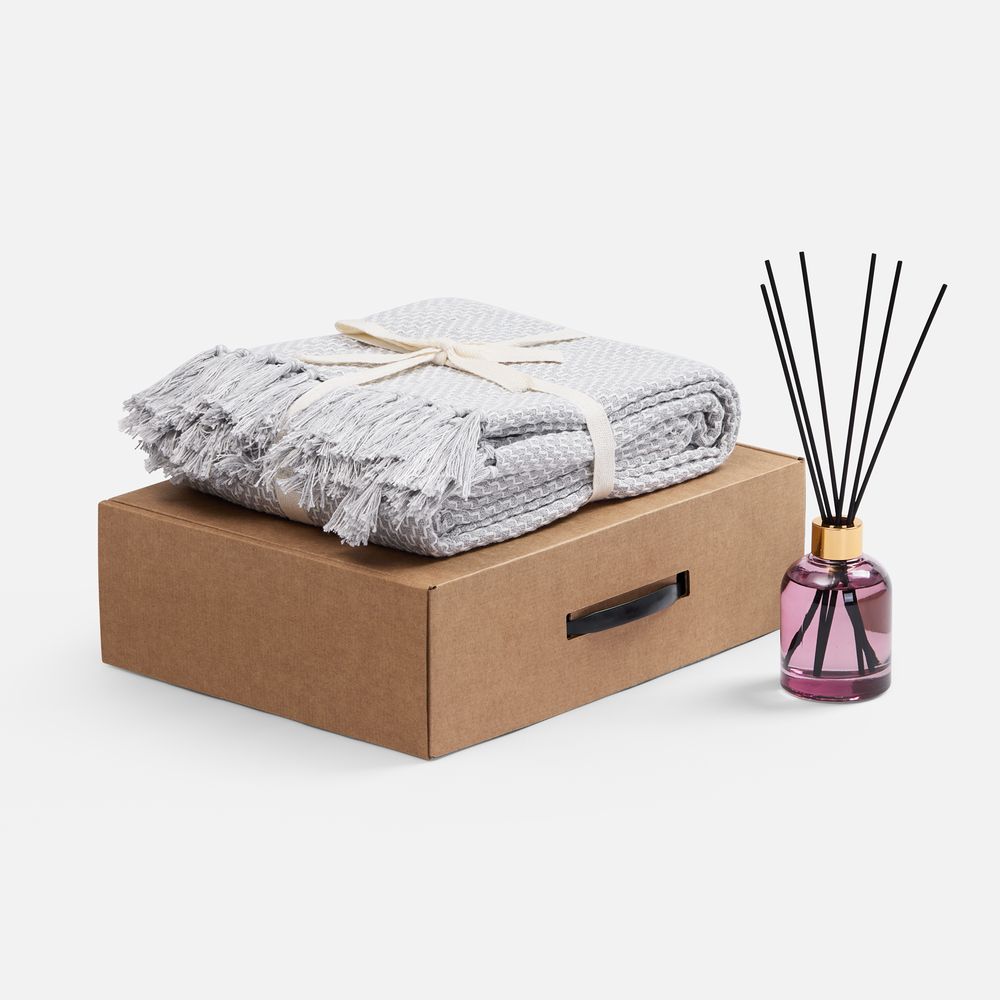 - плед - хлопок 80%, полиэстер 20%, плотность 260 г/м²; флакон - стекло, палочки из файбера; коробка - микрогофрокартон