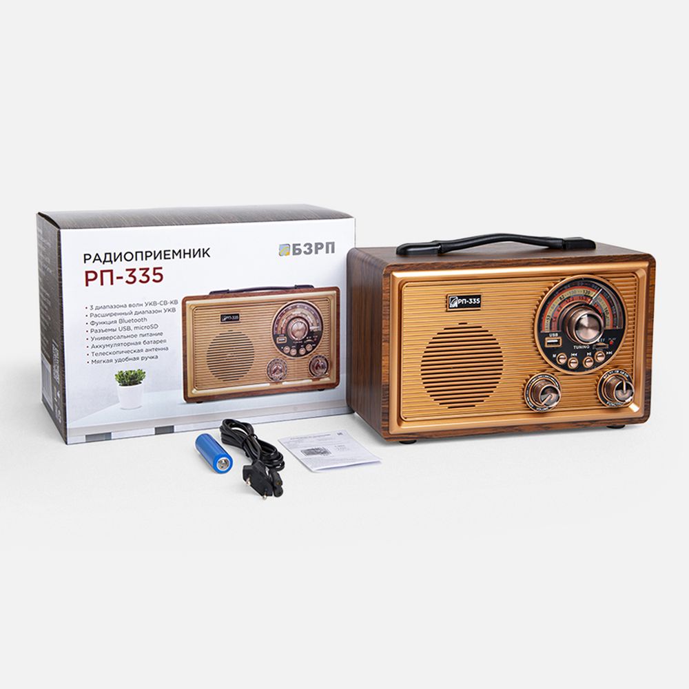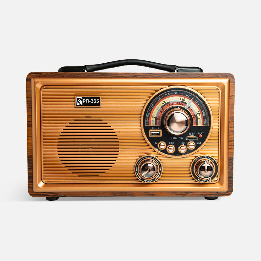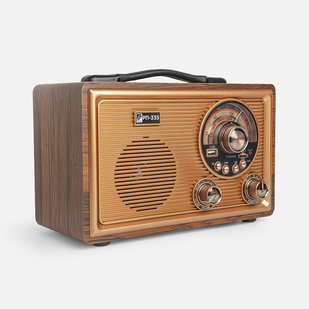 Радиоприемник в ретростиле с аналоговым тюнером отлично дополнит интерьер и удивит своей функциональностью. Модель «РП-335» — это достаточно крупный радиоприемник с удобной мягкой ручкой для переноски.