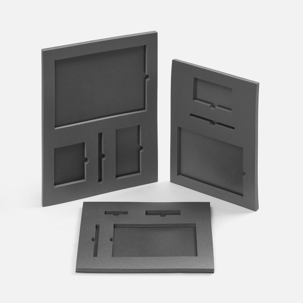 Ложемент, изготовленный из материала Izolon 500 черного цвета, представляет собой многослойную конструкцию, состоящую из нижнего слоя толщиной 5 мм и верхнего слоя толщиной 10 мм. В соответствии с утвержденным макетом, проемы для размещения предметов могут быть спроектированы как в одном, так и в обоих слоях.