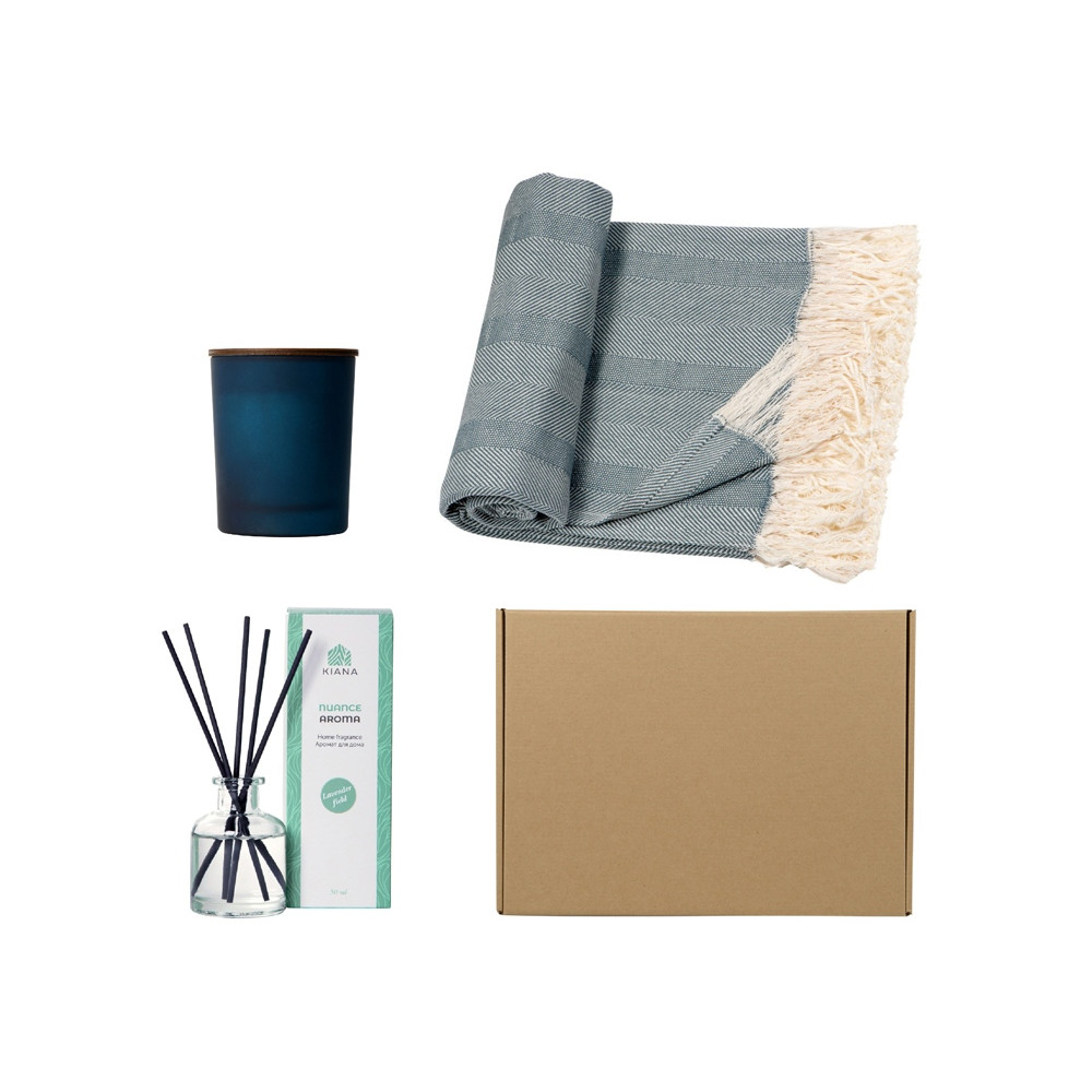 - Материал товара плед - 100% хлопок, аромат для дома - стекло, фибровые палочки, свеча - воск, стекло, дерево, коробка - картон