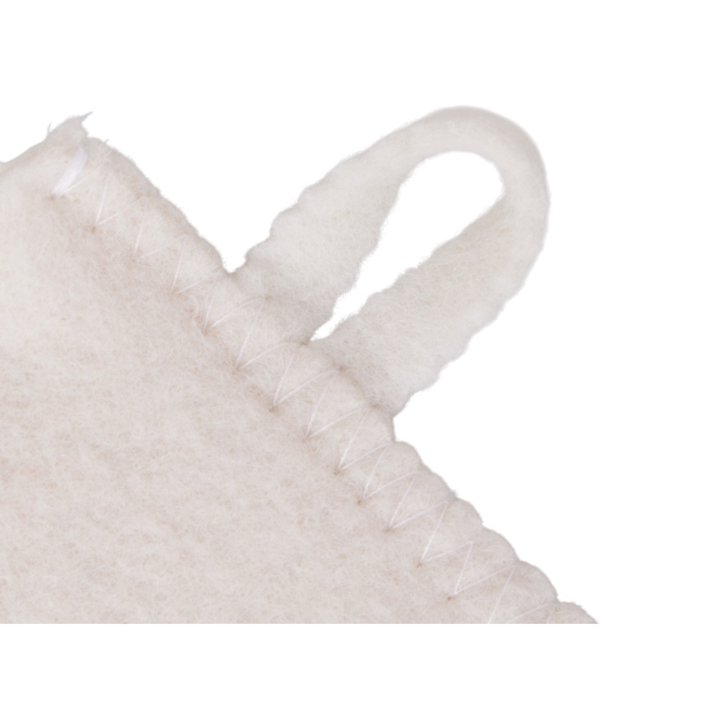 Рукавица для бани и сауны сохранит руки от ожогов при касании печной заслонки или горячего ковша, а также от мозолей при использовании веника. Войлок обладает высокими термоизоляционными свойствами и хорошо впитывает влагу, поэтому наилучшим образом подходит для изготовления банных аксессуаров. • Защищает от ожогов и мозолей • Хорошо впитывает влагу • Быстро сохнет Рекомендуется ручная стирка при 30°C с использованием специальных средств для шерсти или мягкого мыла.