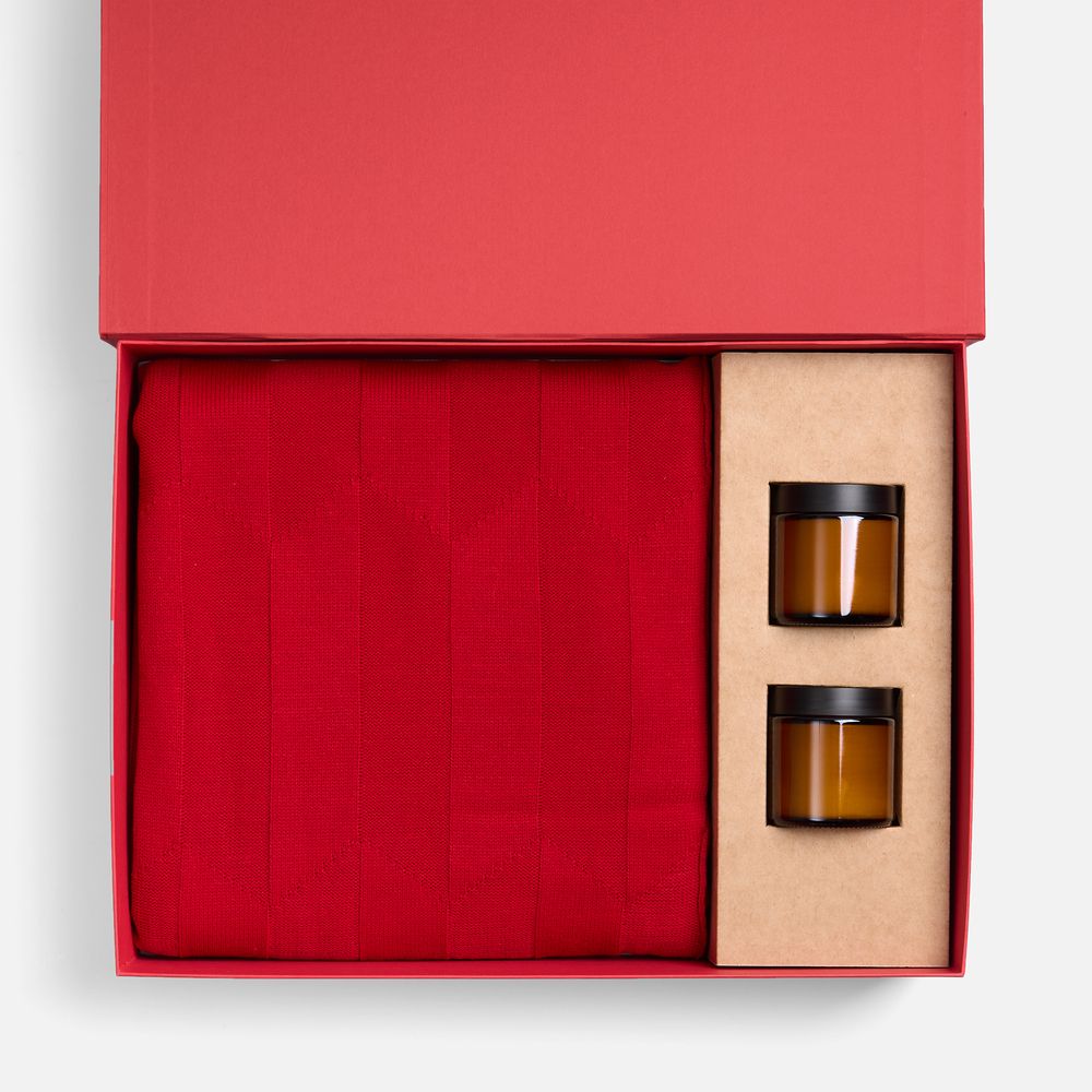 • плед - акрил 100%, плотность 286 г/м²; подсвечник - стекло, крышка - пластик; свеча - парафин, соевый воск, парфюмерная композиция; коробка - переплетный картон, бумага Сurious