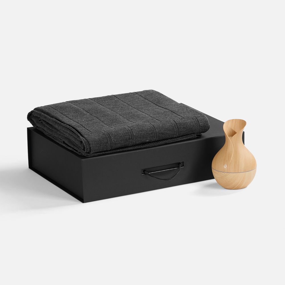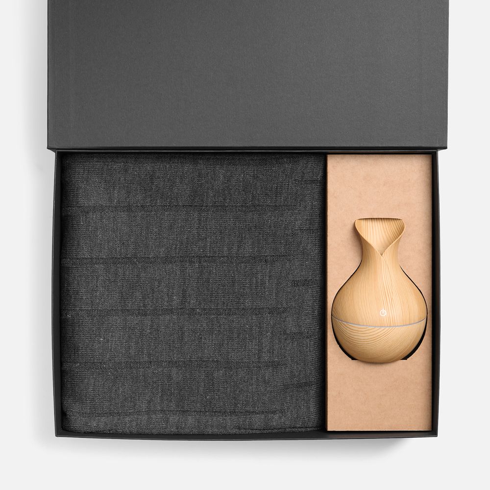 Плед с мягкой текстурой приглашает расслабиться в тепле, а изящный увлажнитель-ароматизатор создает в помещении атмосферу гармонии.