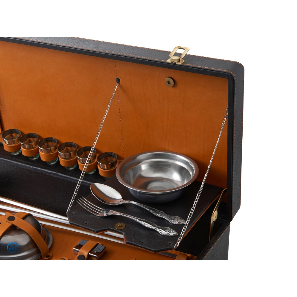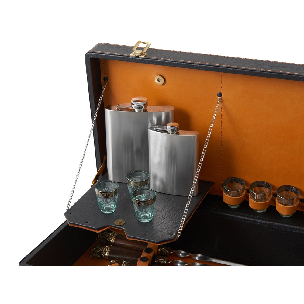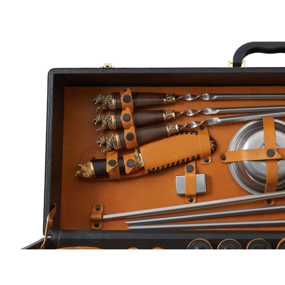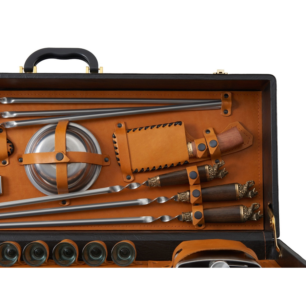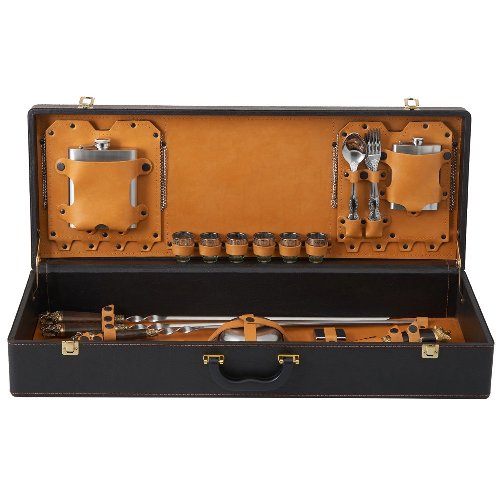 - Комплектность шампура большие- 6 шт, фляга большая, фляга малая, вилка- 6 шт, ложка- 6 шт, стопка- 6 шт, нож Тяпка, нож разделочный, зажигалка, тарелка- 6 шт
