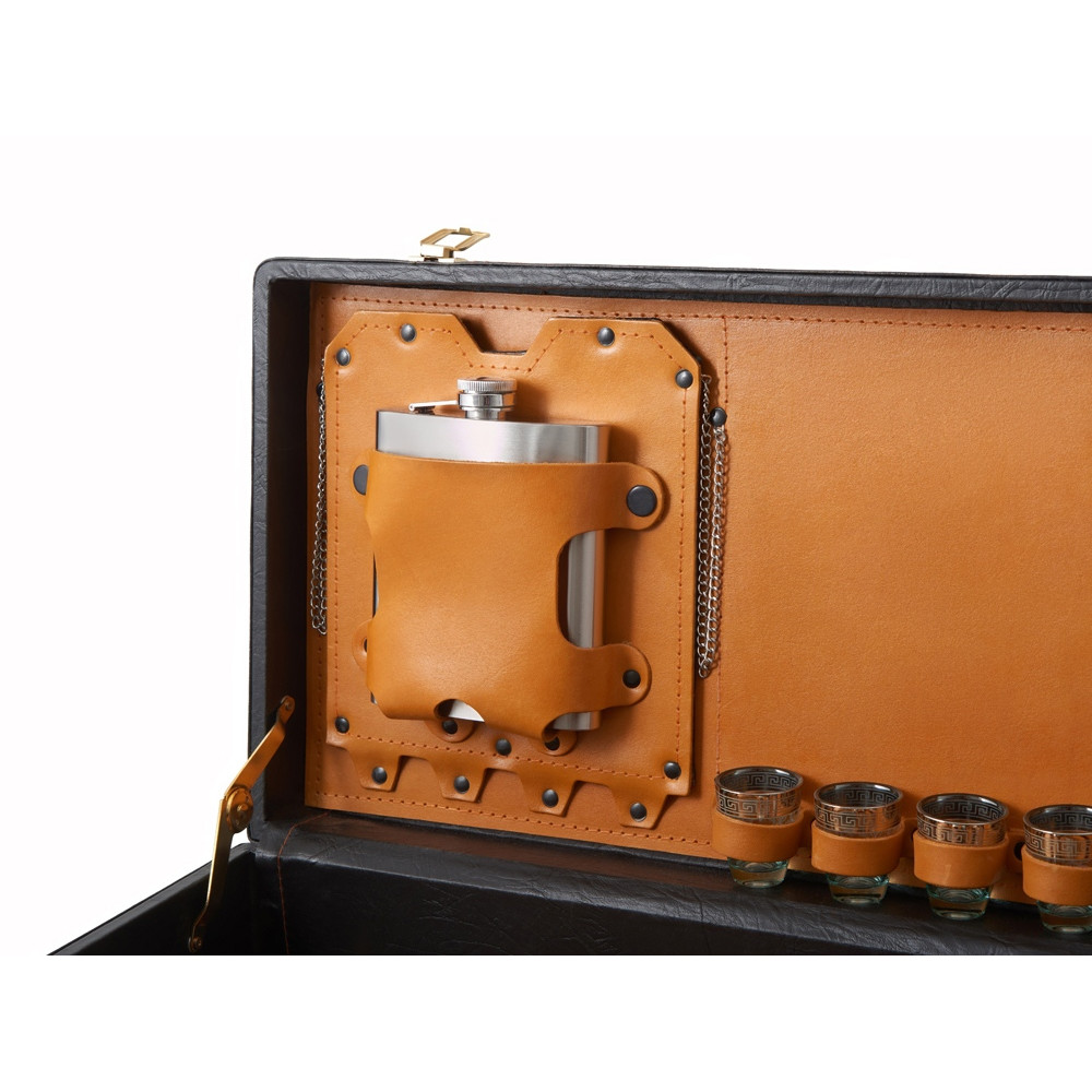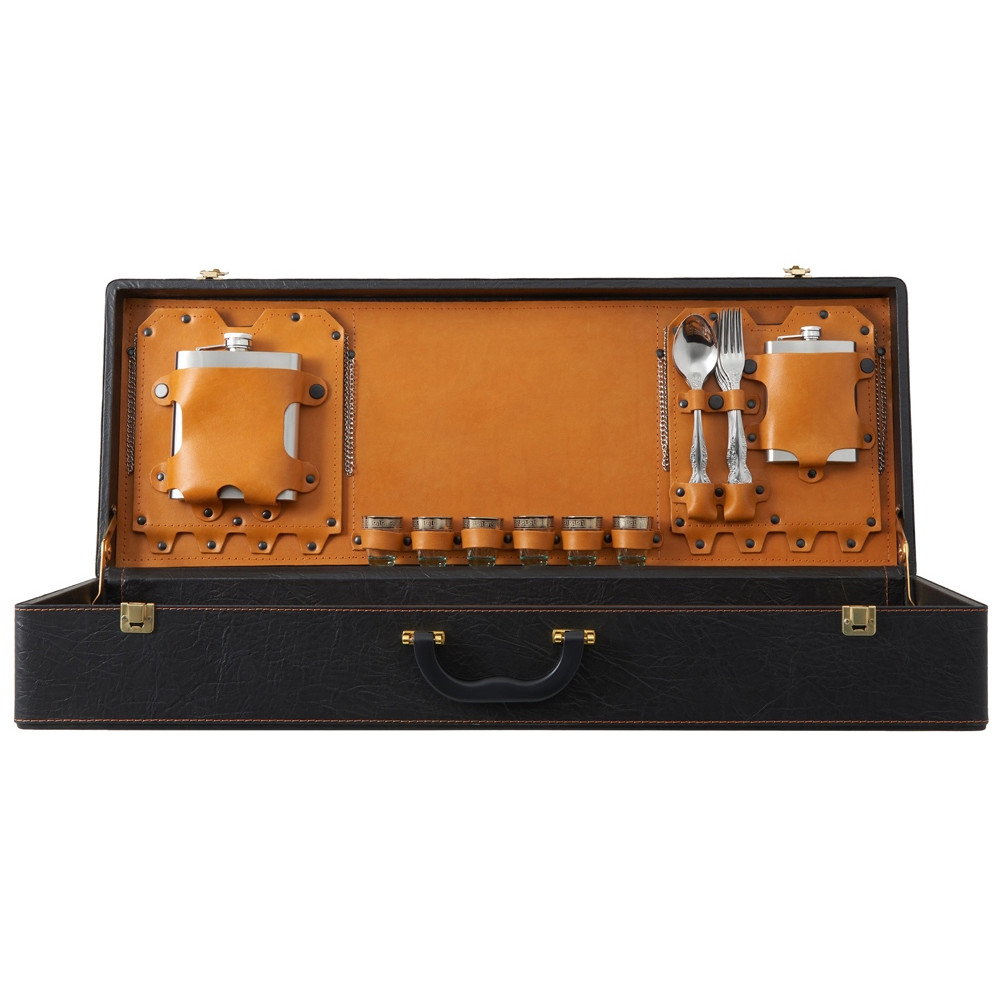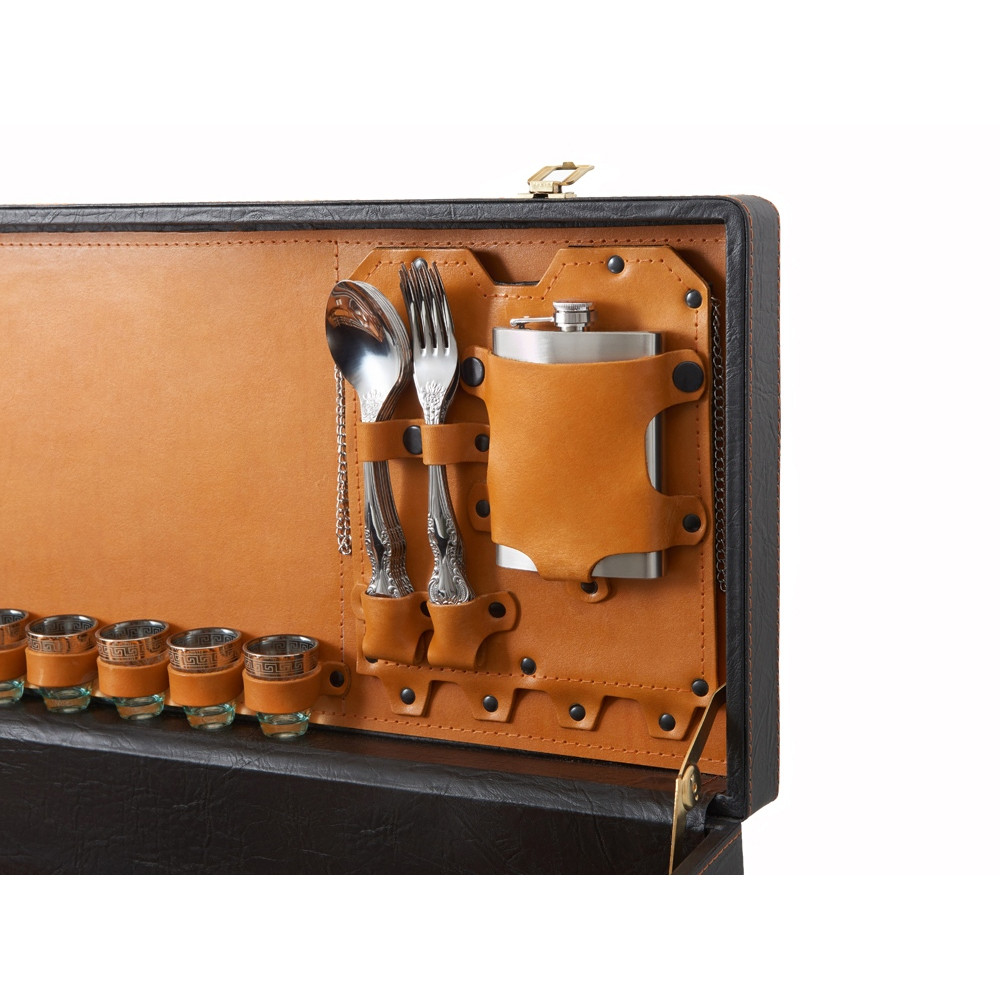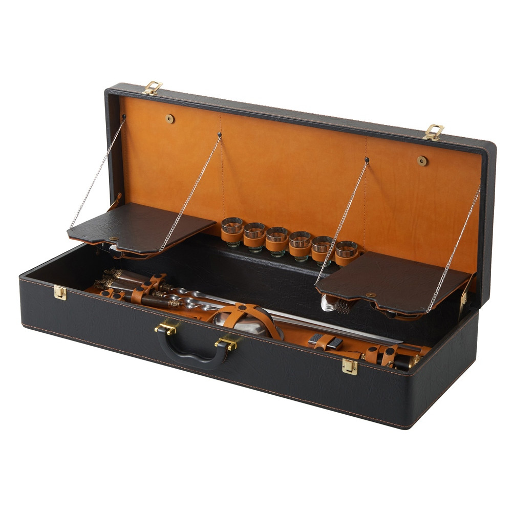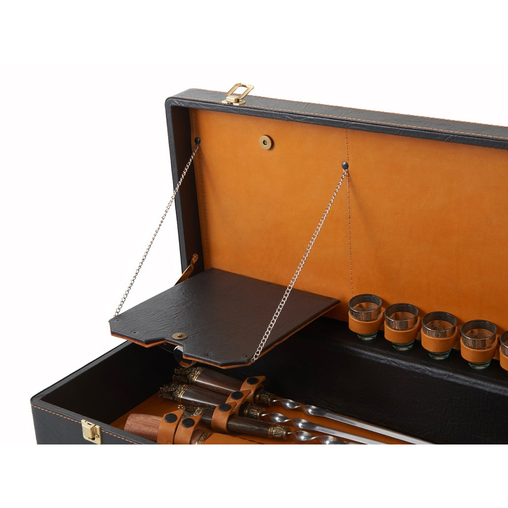 - Комплектность шампура большие- 6 шт, фляга большая, фляга малая, вилка- 6 шт, ложка- 6 шт, стопка- 6 шт, нож Тяпка, нож разделочный, зажигалка, тарелка- 6 шт