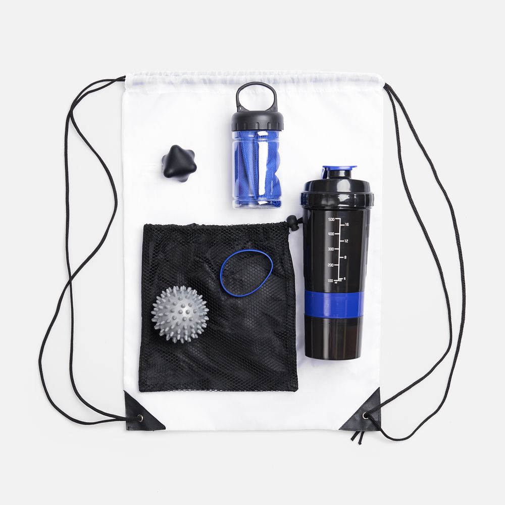 Чтобы оздоровительные фитнес-мероприятия приносили только удовольствие, в практичном рюкзаке-мешке собраны продуманные аксессуары: охлаждающее полотенце, спортивный шейкер для смешивания самых полезных коктейлей, массажные мячики для самостоятельного миофасциального релиза после занятий, а также силиконовый браслет, без которого не обойтись членам клуба.