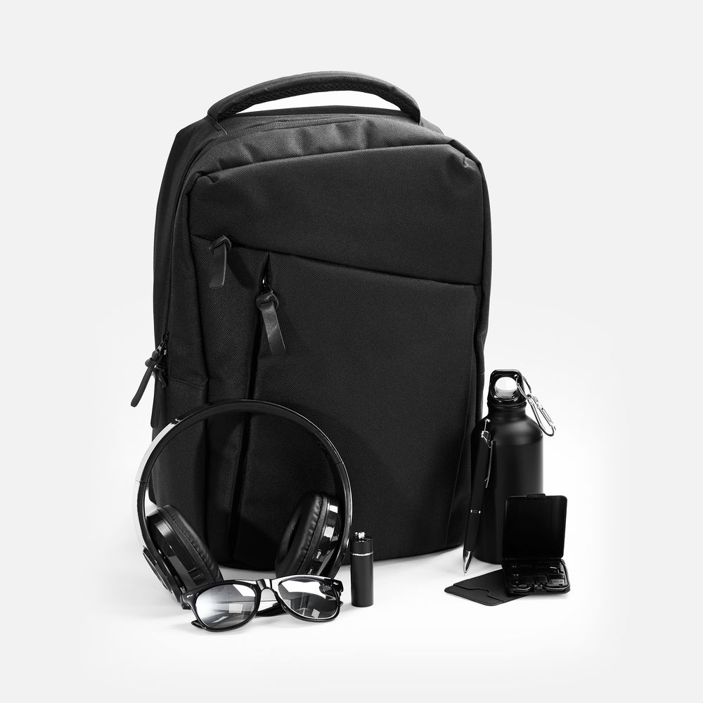 В нем собраны 8 продуманных и полезных аксессуаров в элегантном черном исполнении: рюкзак для ноутбука, беспроводные наушники, органайзер с беспроводной зарядкой и набором адаптеров, бутылка для воды, чехол для карты на телефон, солнцезащитные очки, брелок-фонарик и шариковая ручка с покрытием софт-тач. В такой компании получится эффективно организовать рабочее время и пространство, а также подчеркнуть деловой статус в любой ситуации.