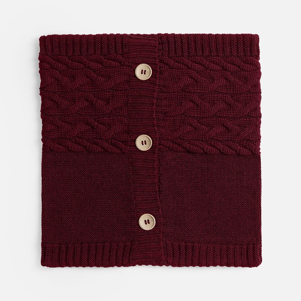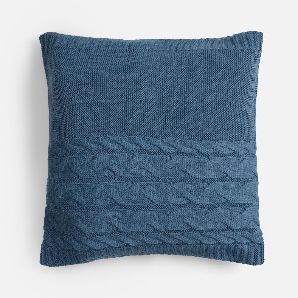 Вязаный чехол надевается на подушку из спанбонда, наполнитель — синтепон. Чехол крепится на три пуговицы.